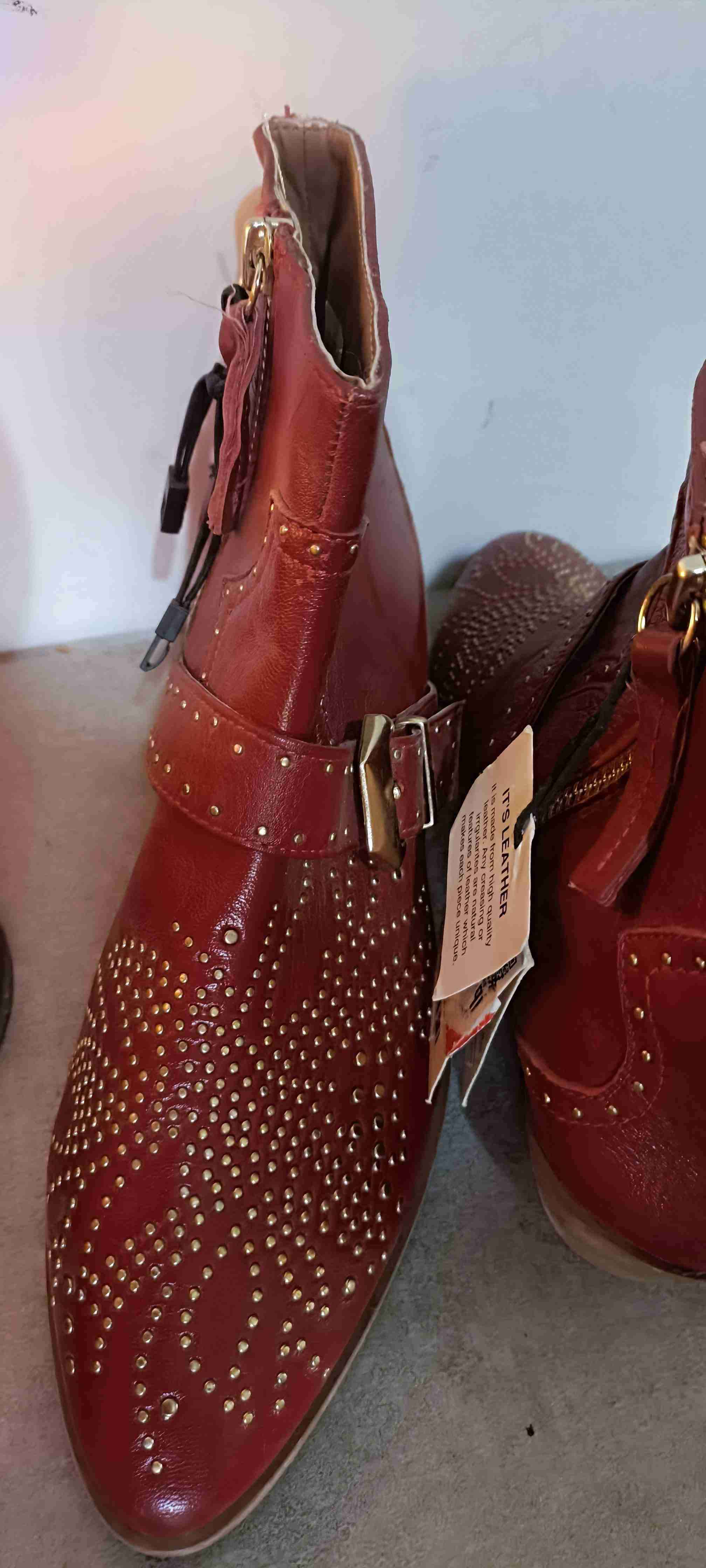 Elegantes botines marca Zara, en cuero rojo con detalles de tachas doradas. En buen estado, ideales para darle estilo a cualquier atuendo diario o formal. Talla 36-37