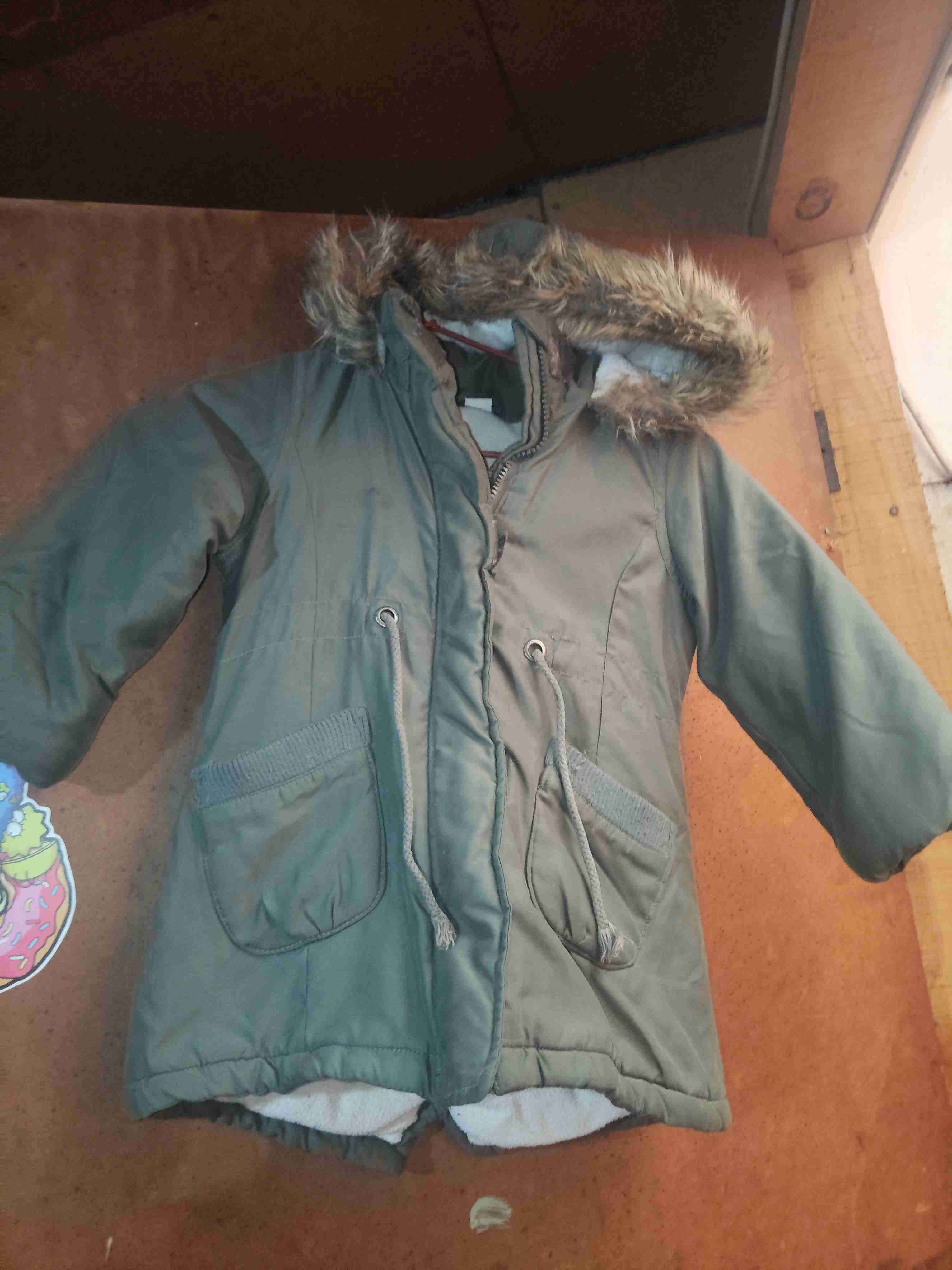 Abrigo verde para invierno con capucha cubierta de piel sintética. Está en buen estado, ideal para días fríos. Talla 2-3