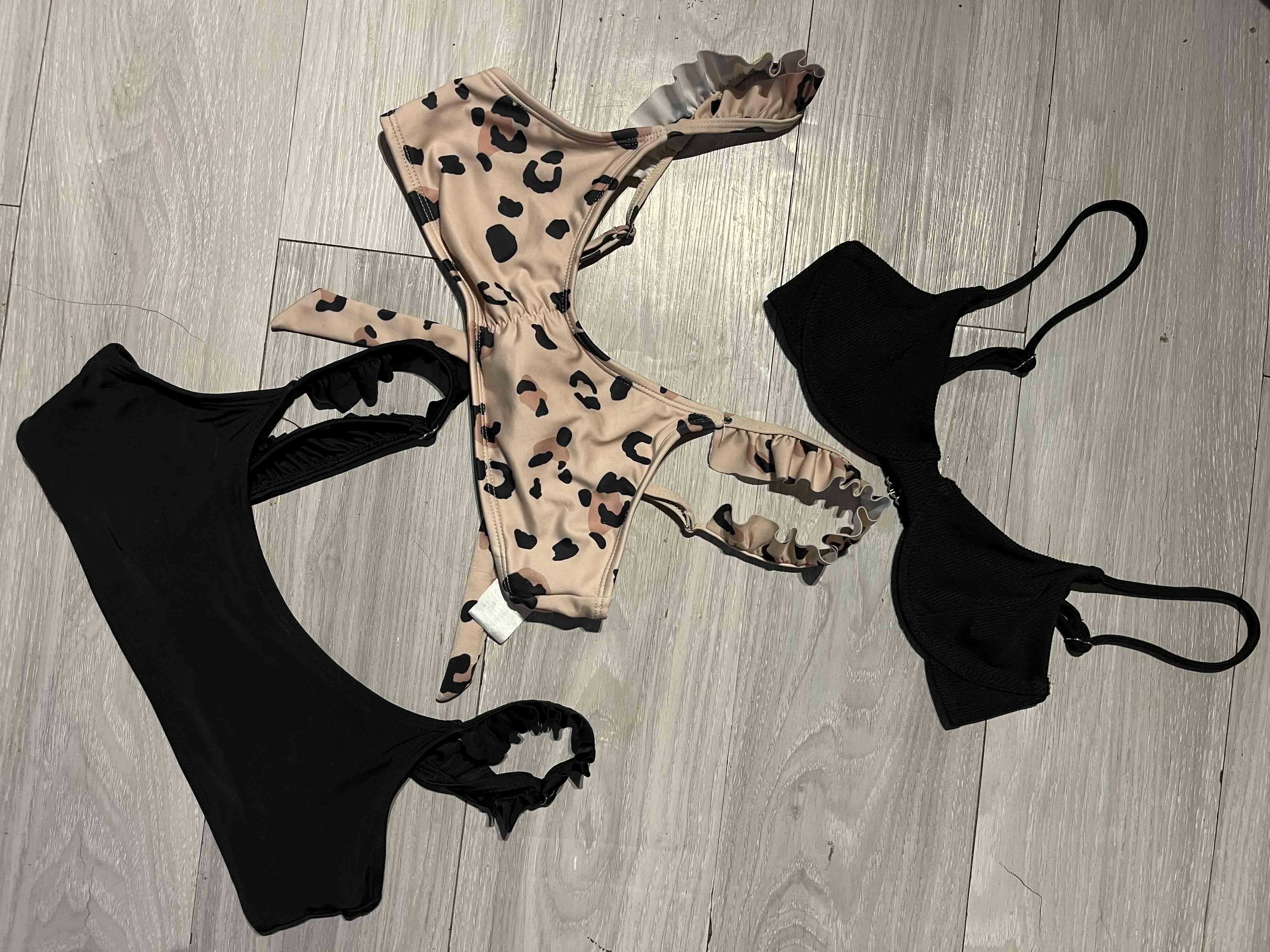 tres bikinis en buen estado, dos negro y otro con estampado de leopardo. Perfectos para el verano o la piscina.