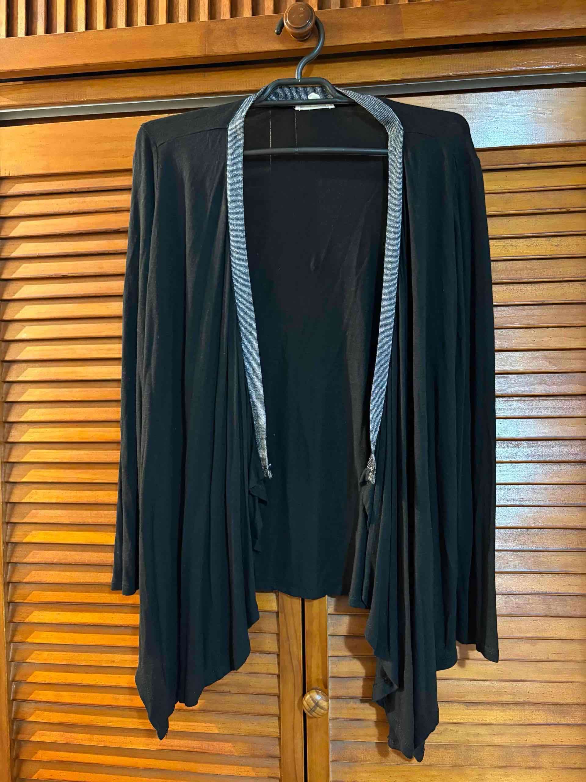 Cárdigan negro elegante con borde gris brillante. Perfecto para un look casual o formal.