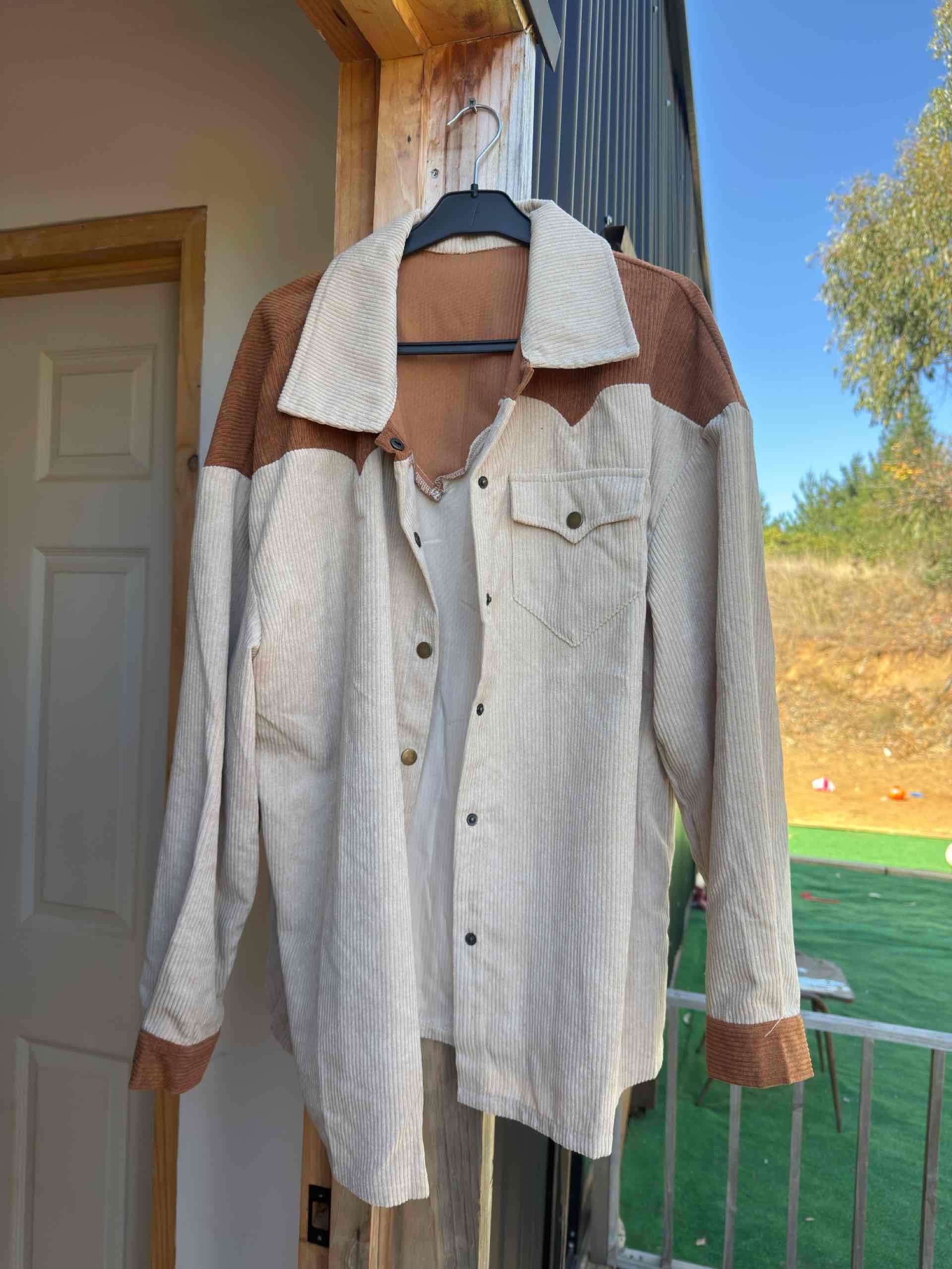 Sobre camisa de pana en tonos beige y marrón, ideal para el otoño. En buen estado general con signos leves de uso.