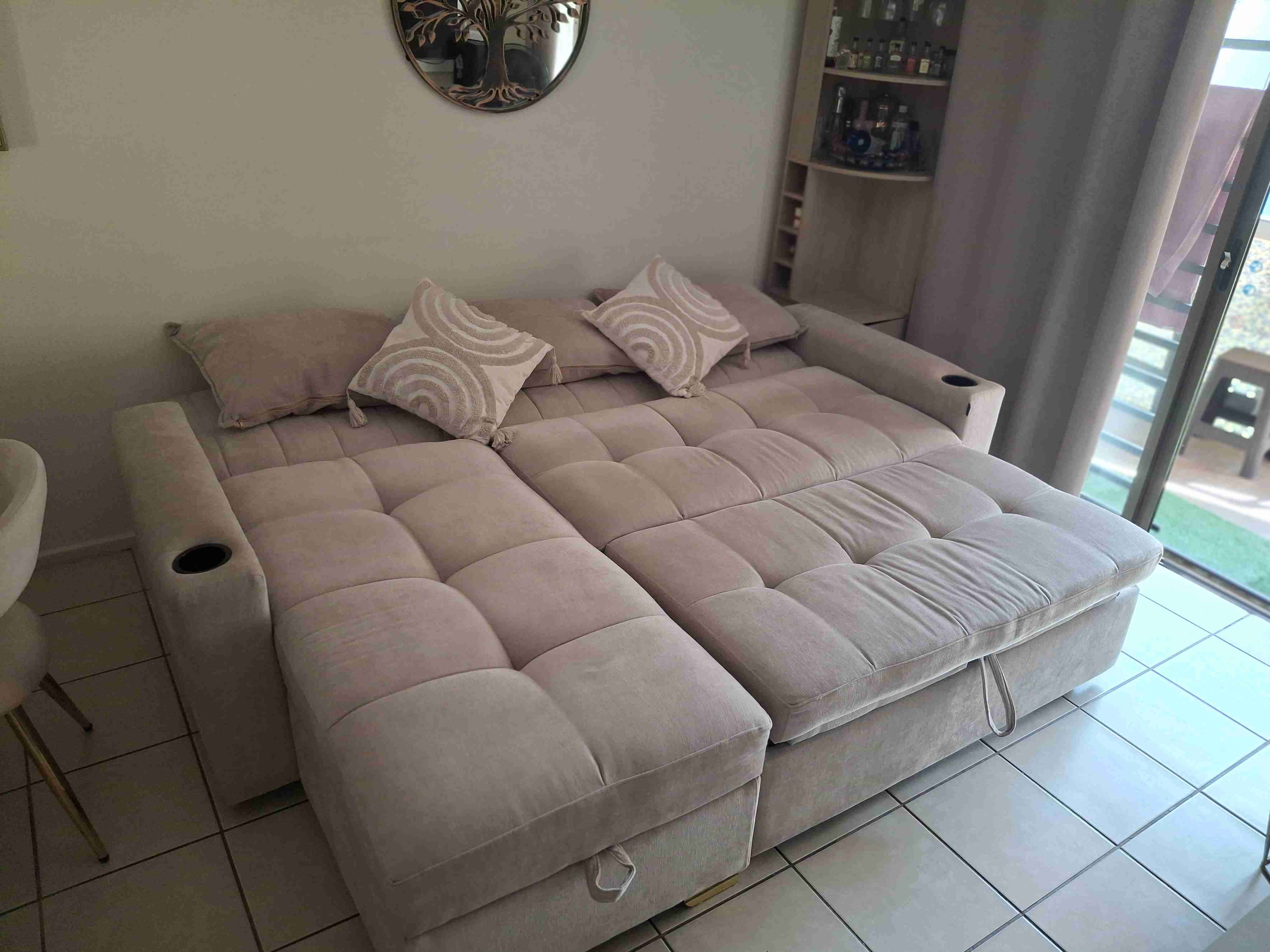 Sofá cama cómodo en tono beige, ideal para sala de estar. Esta en perfecto estado con cojines incluidos , tela impermeabilizada y porta vasos personalizados