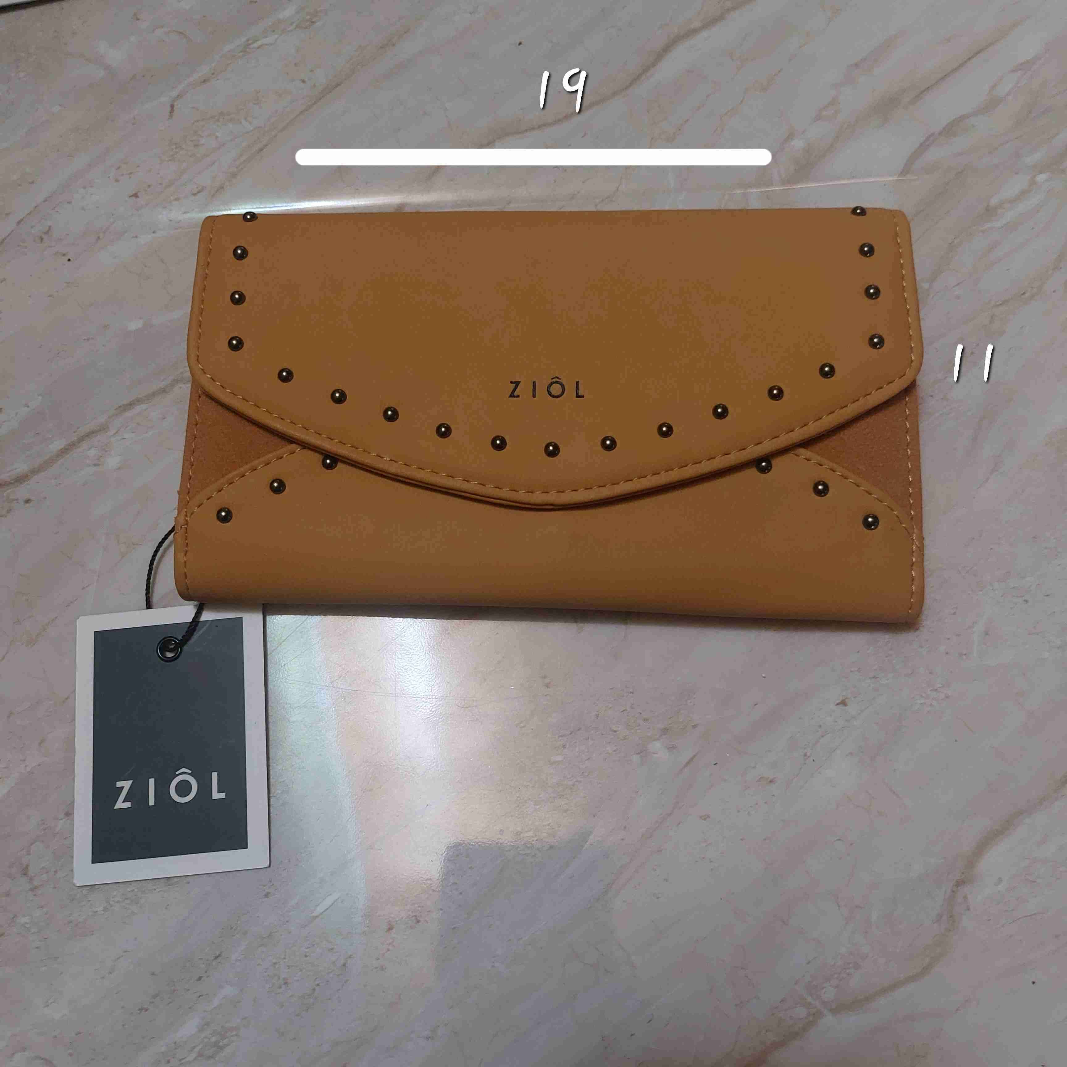 Elegante cartera Ziol en color mostaza con detalles de tachas. Perfecta para cualquier ocasión.medidas en foto