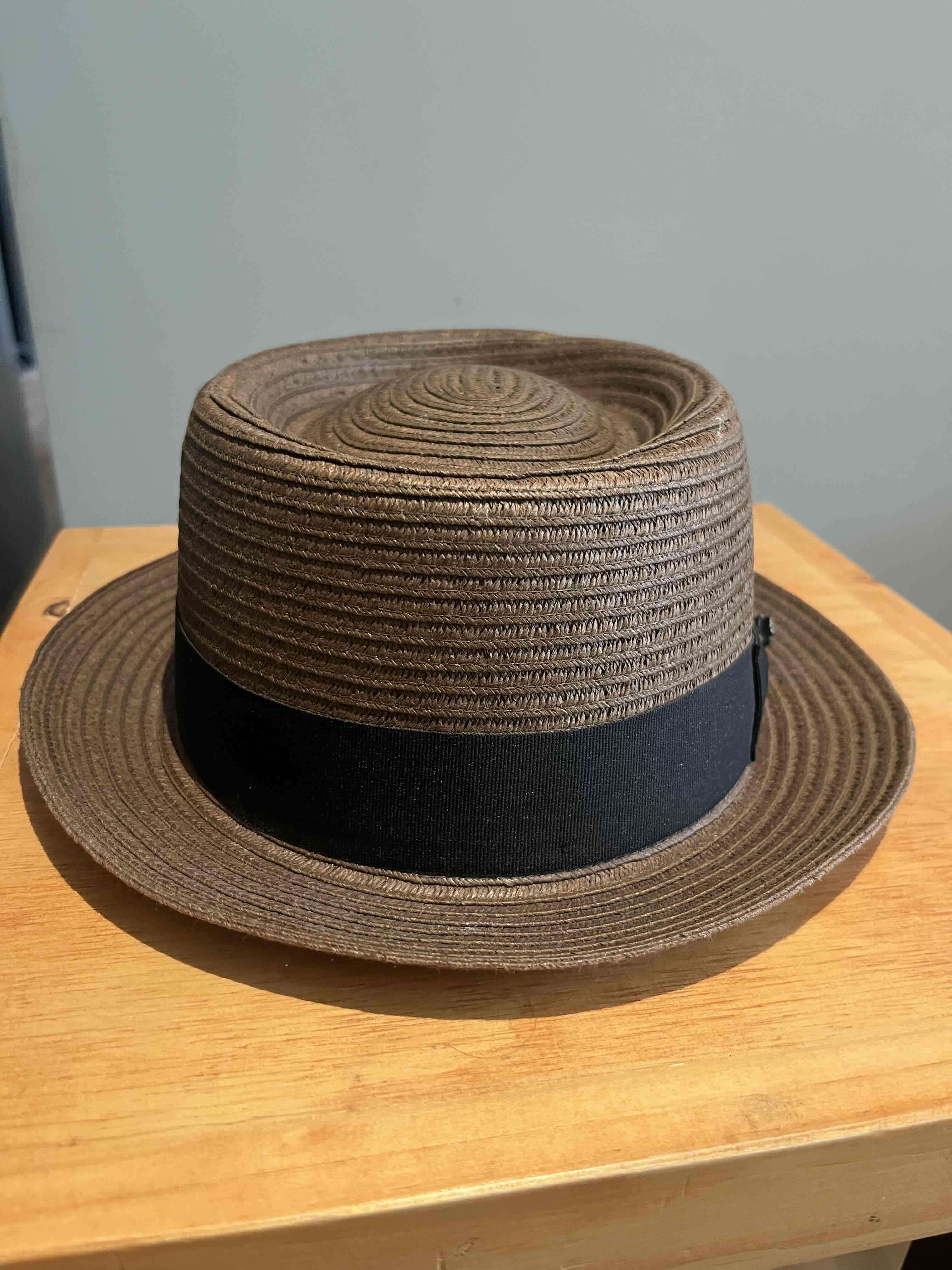 Elegante sombrero de papel trenzado en marrón con cinta negra. Ideal para días soleados y ocasiones informales. Nuevo.