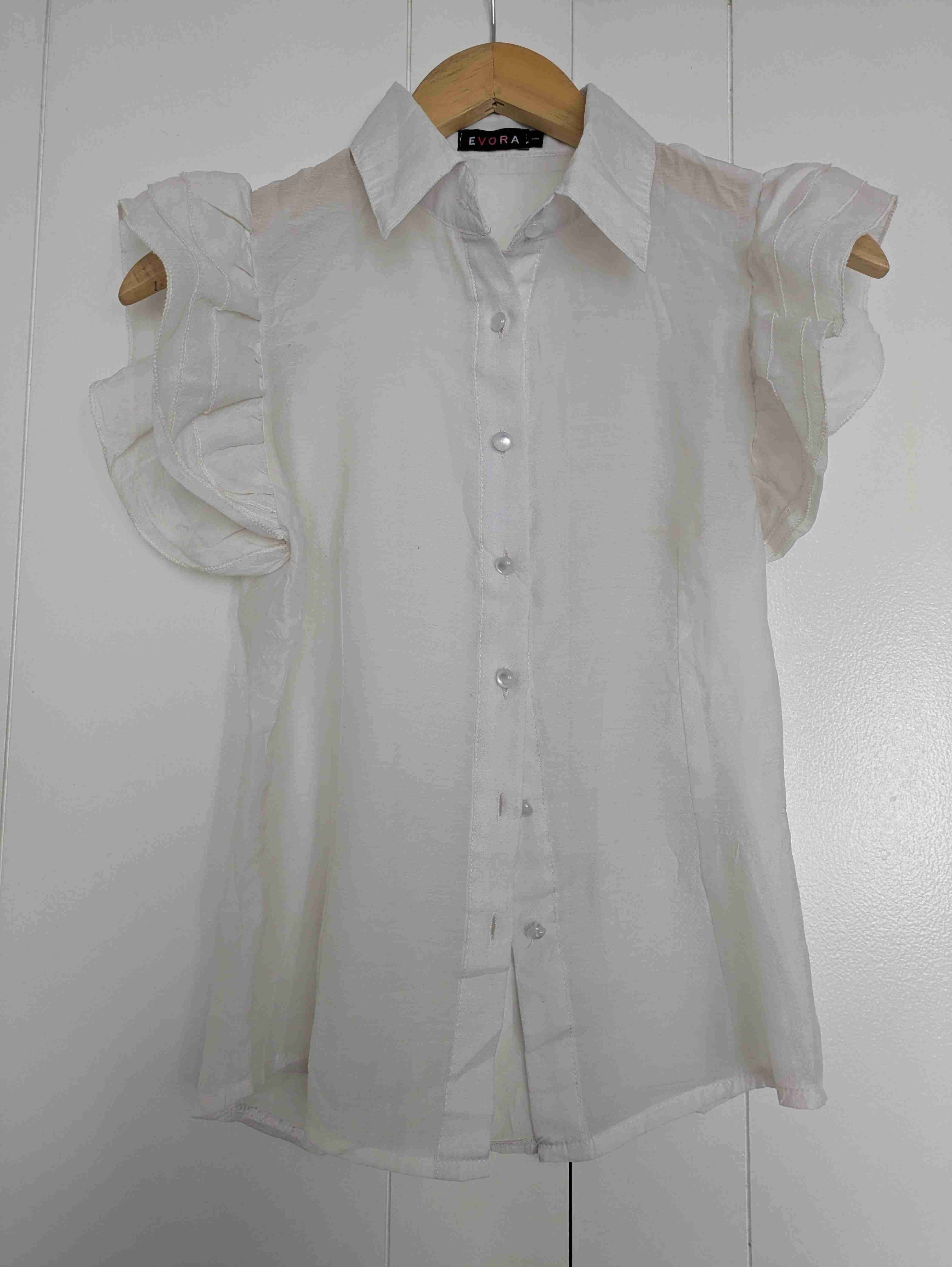 Blusa blanca con mangas plisadas, ideal para ocasiones formales. En buen estado y tela ligera.