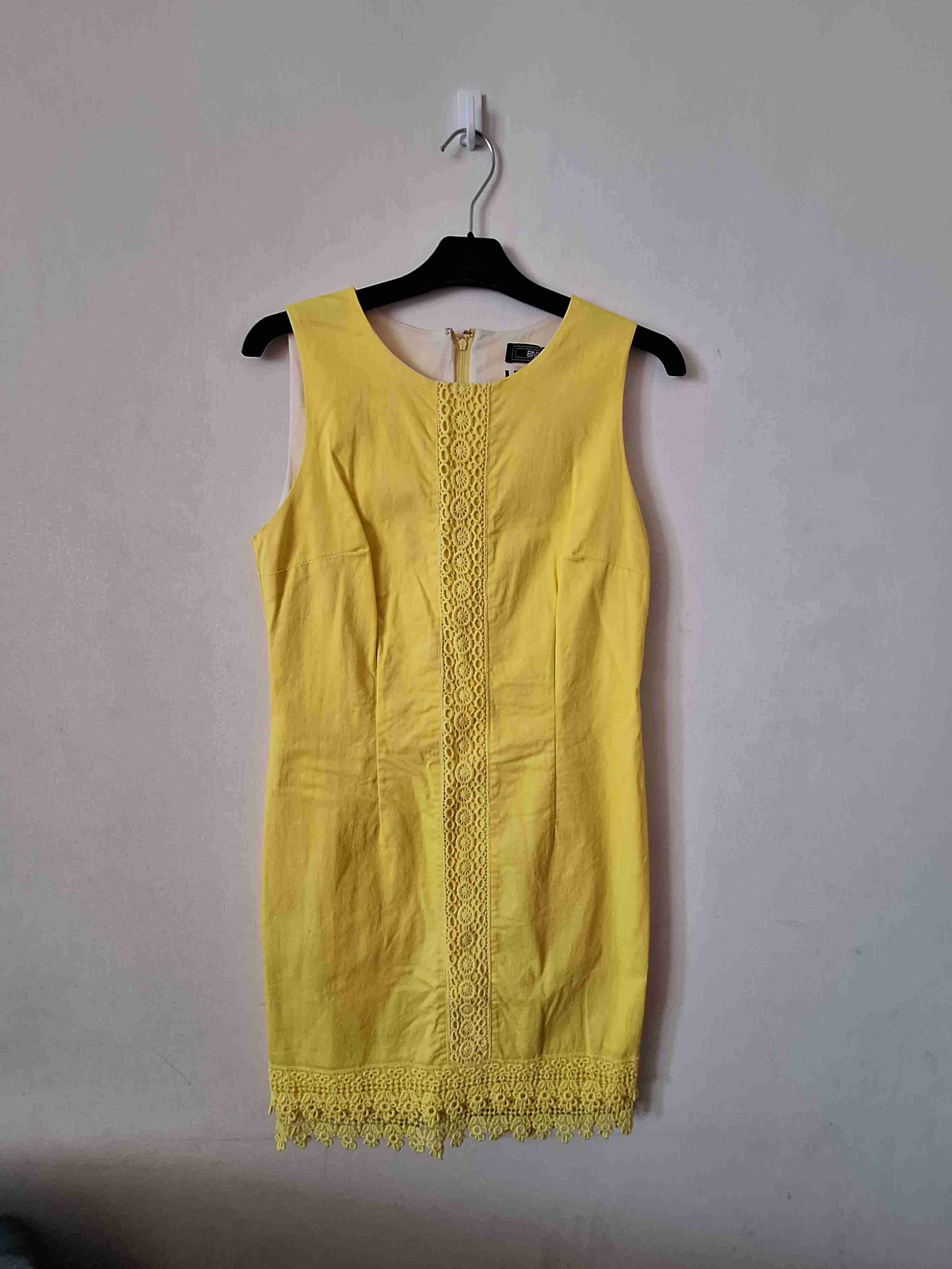 Vestido sin mangas color amarillo con detalles de encaje. Ideal para el verano, en buen estado.