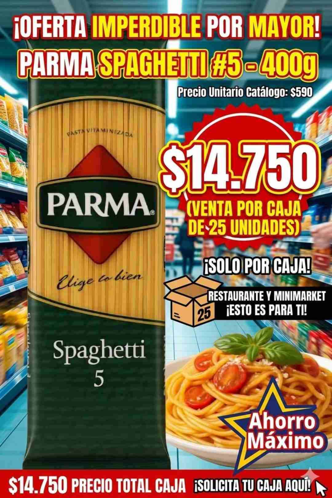 Spaghetti Parma #5, ideal para restaurantes y minimarkets. Venta por caja de 25 unidades. Ahorro garantizado. Tel: 9 6223 6970