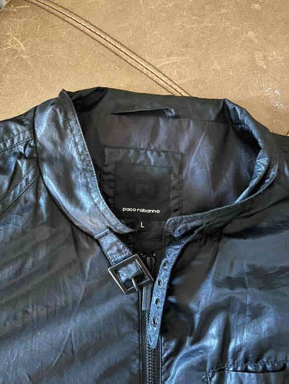Elegante chaqueta negra de Paco Rabanne, Talla L. Ideal para otoño. En excelente estado, con ligero brillo y cierre frontal. Perfecta para un look casual o formal.