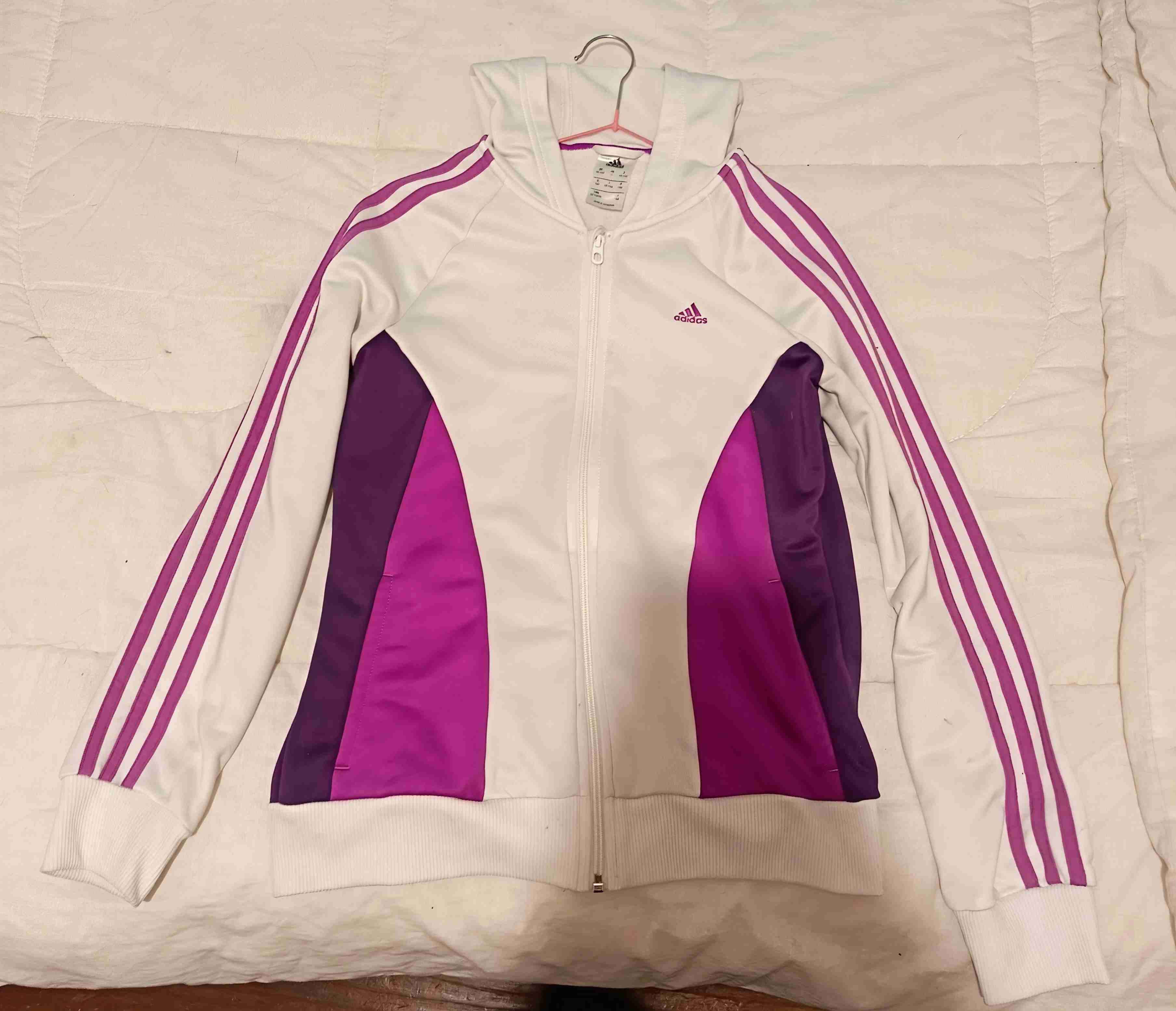 Polerón deportivo adidas con capucha, diseño en blanco y morado. Ideal para el gimnasio o actividades al aire libre.