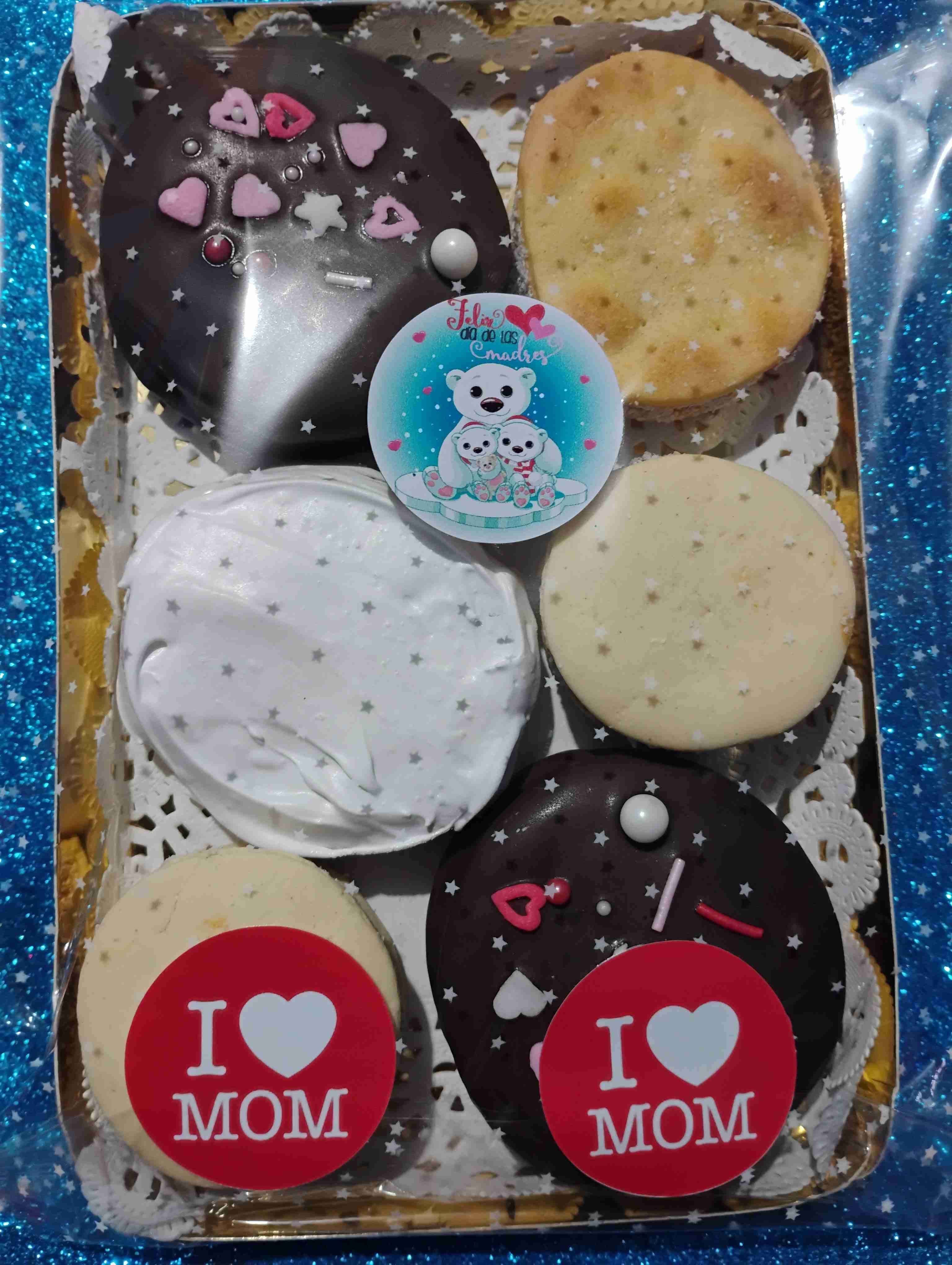 Caja de alfajores artesanales ideales para celebrar el Día de la Madre. Decoradas con chocolate y mensajes especiales. Caja de 6 unidades distintas variedades. Alfajores artesanal hecho con galleta casera. Alfajor de Maicena. Alfajor chileno. Pedidos al teléfono (931346316).