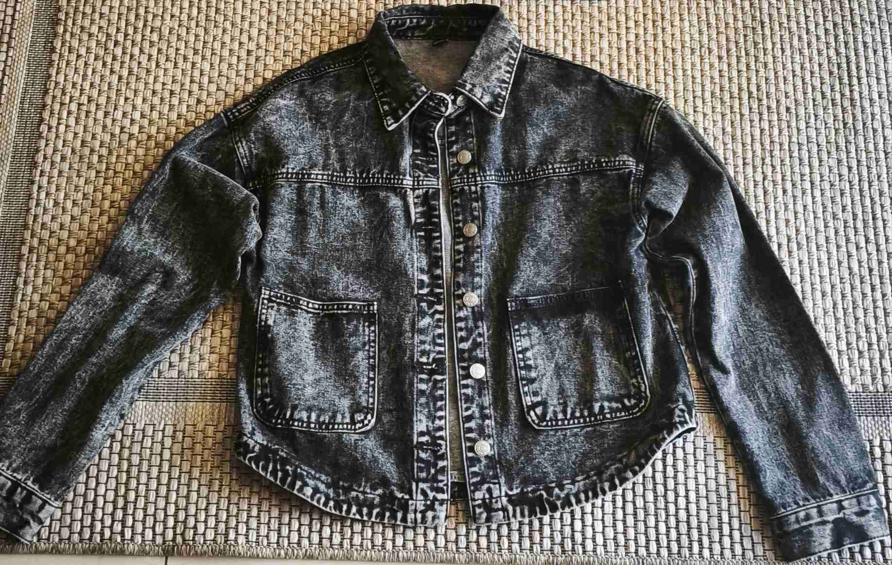 Chaqueta de mezclilla en color negro con efecto gastado. Ideal para agregar un toque casual a cualquier atuendo. Es talla XS pero me sirve a mi que mido 1.70 y normalmente soy talla M