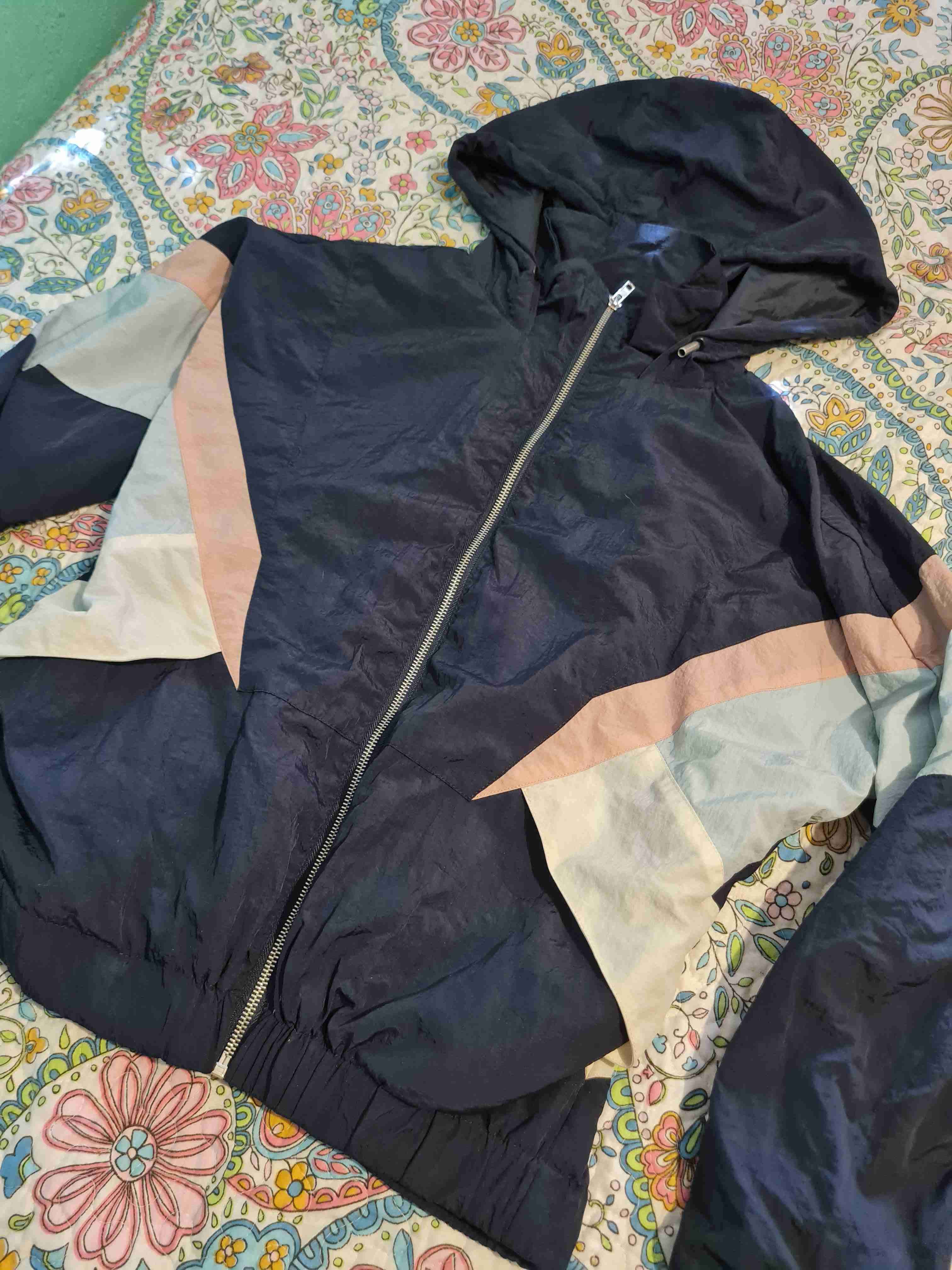 Chaqueta liviana con diseño en bloques de color, perfecta para días ventosos. En buen estado con uso leve.