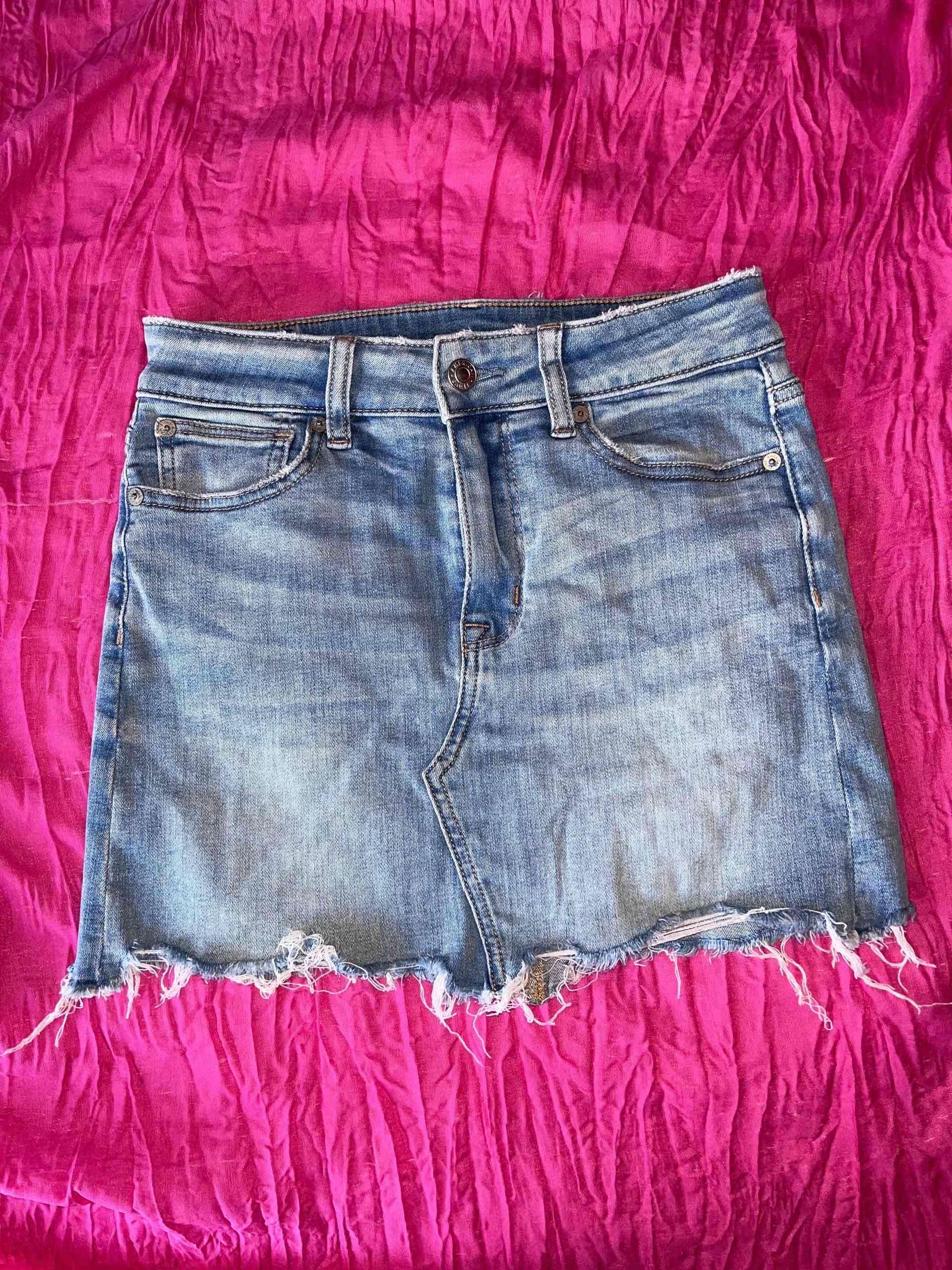 Linda falda de mezclilla con diseño desgastado perfecto para verano. Se ve en buena condición con leves signos de uso.