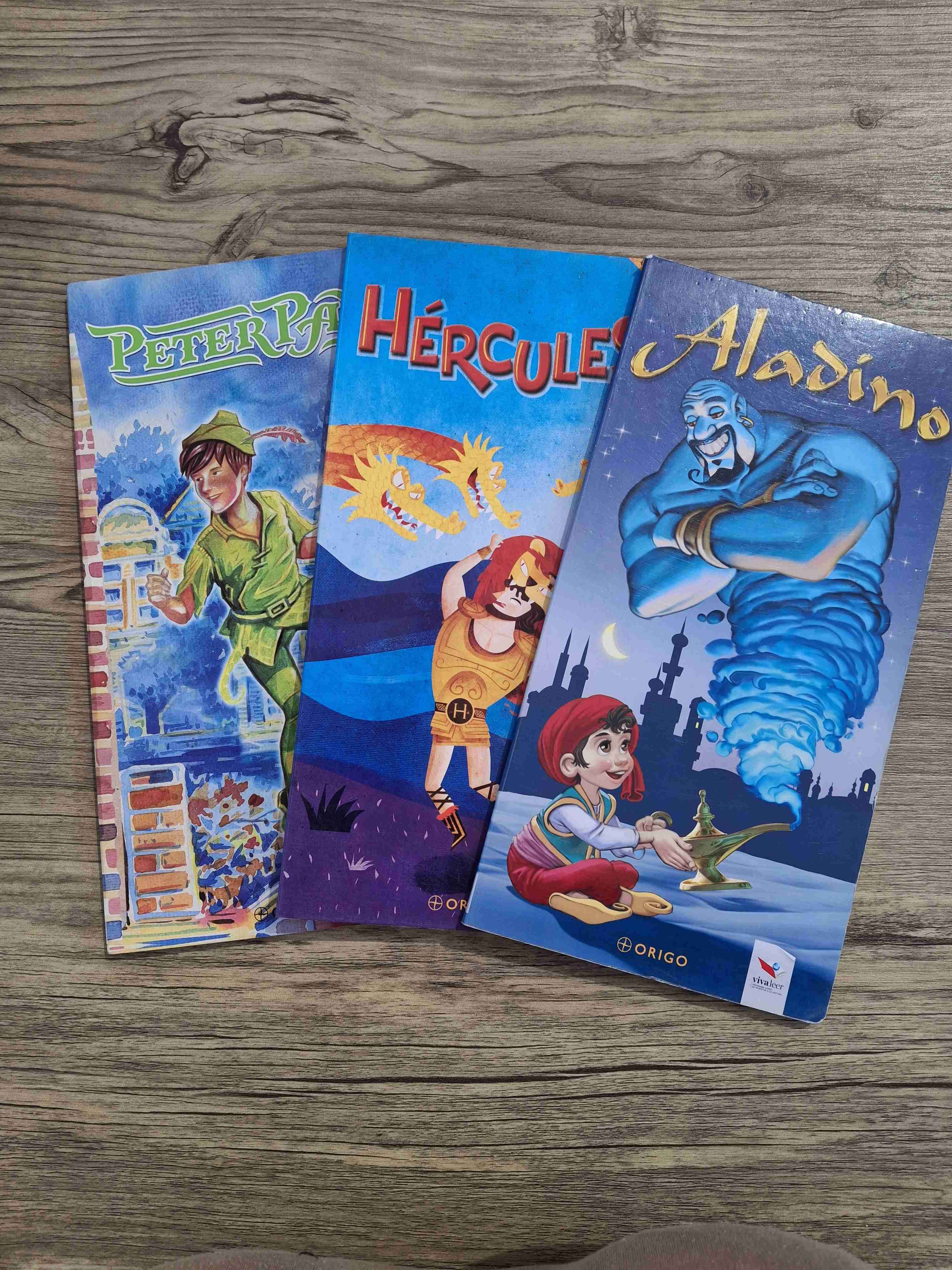Conjunto de tres cuentos infantiles: Peter Pan, Hércules y Aladino. Ideal para la hora de dormir. Buen estado, detalles de uso.