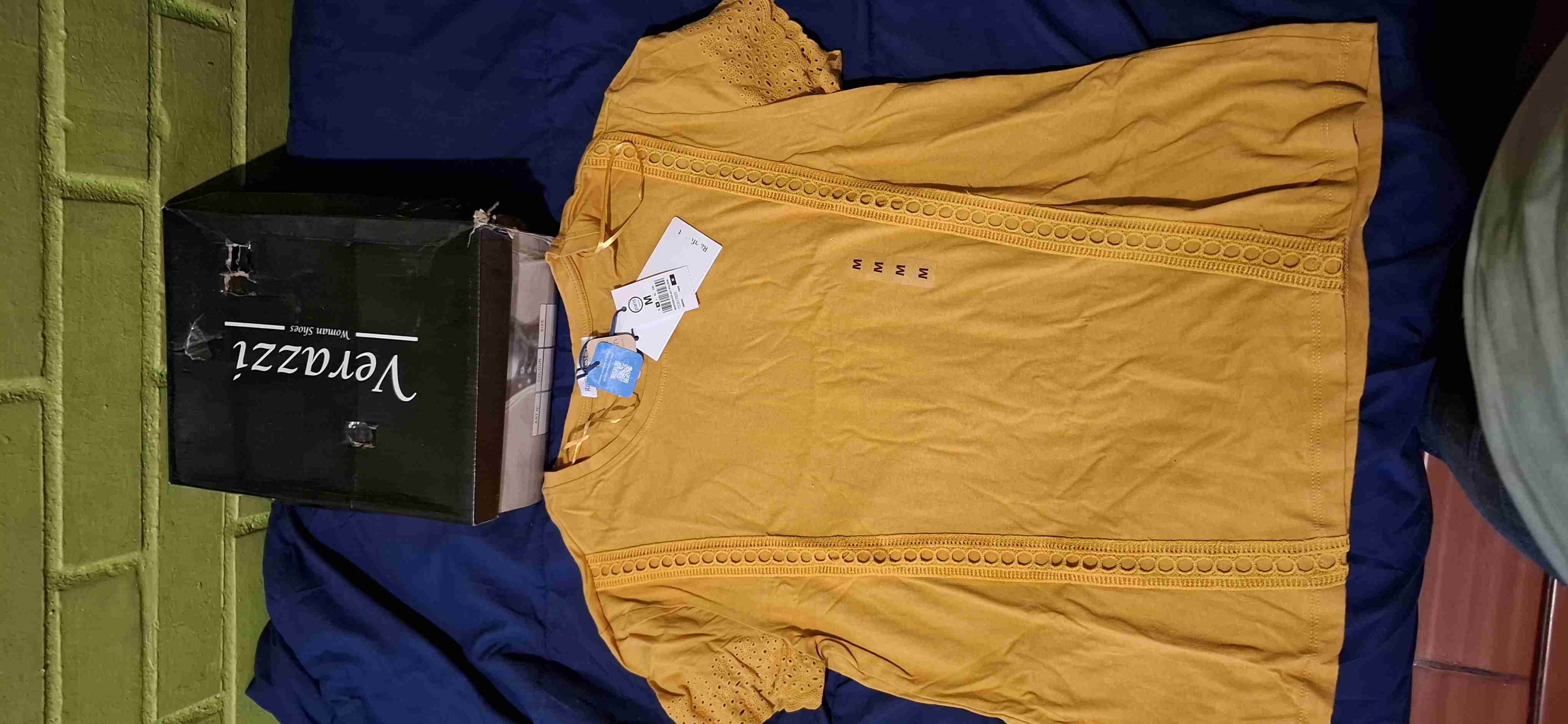 Polera amarilla con encaje en las mangas y al frente, ideal para un look casual. En buen estado, conservada en su caja original.