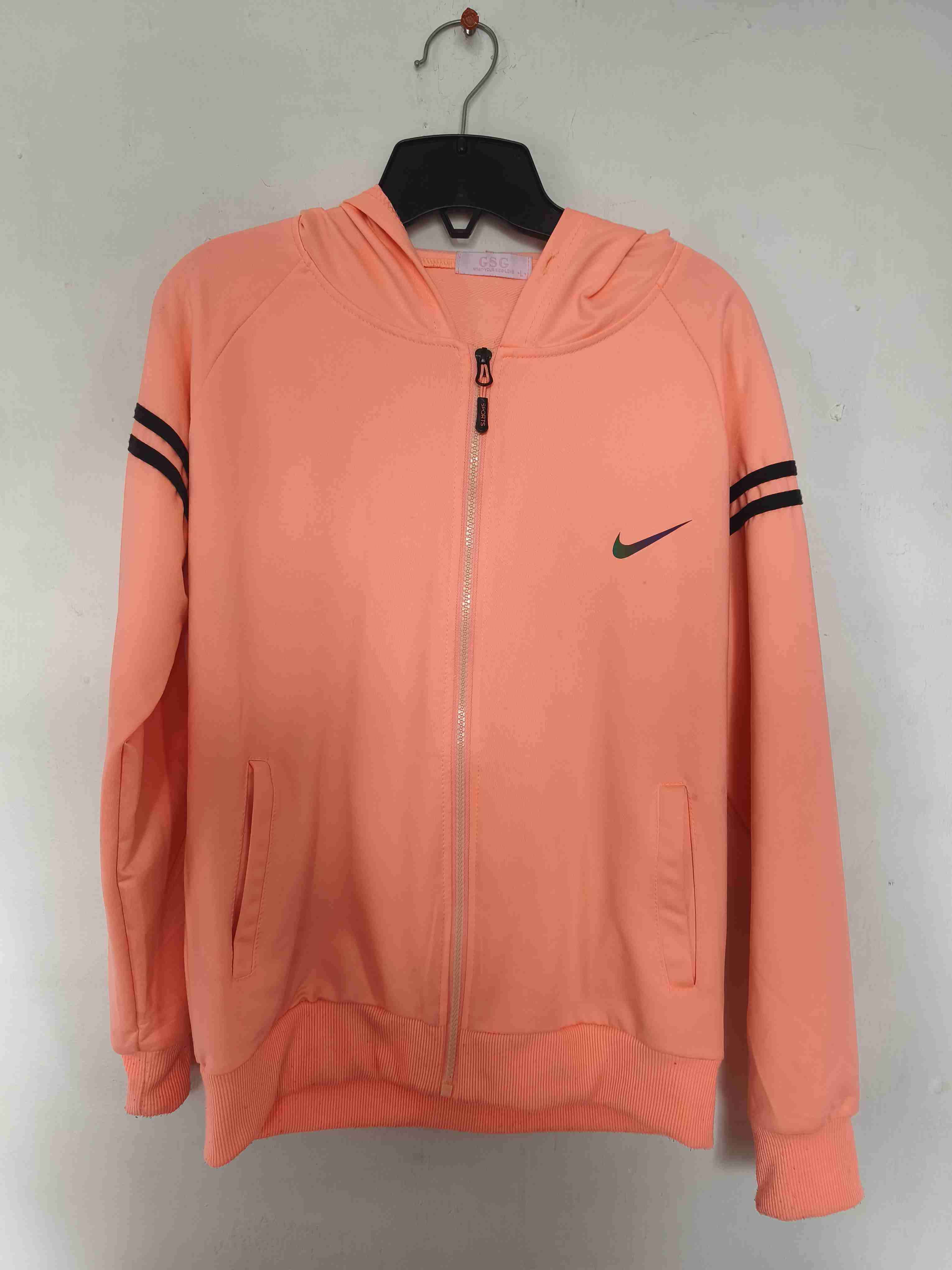 Polerón de color coral con cierre y capucha, ideal para actividades deportivas o uso casual. En buen estado general. Talla M/L