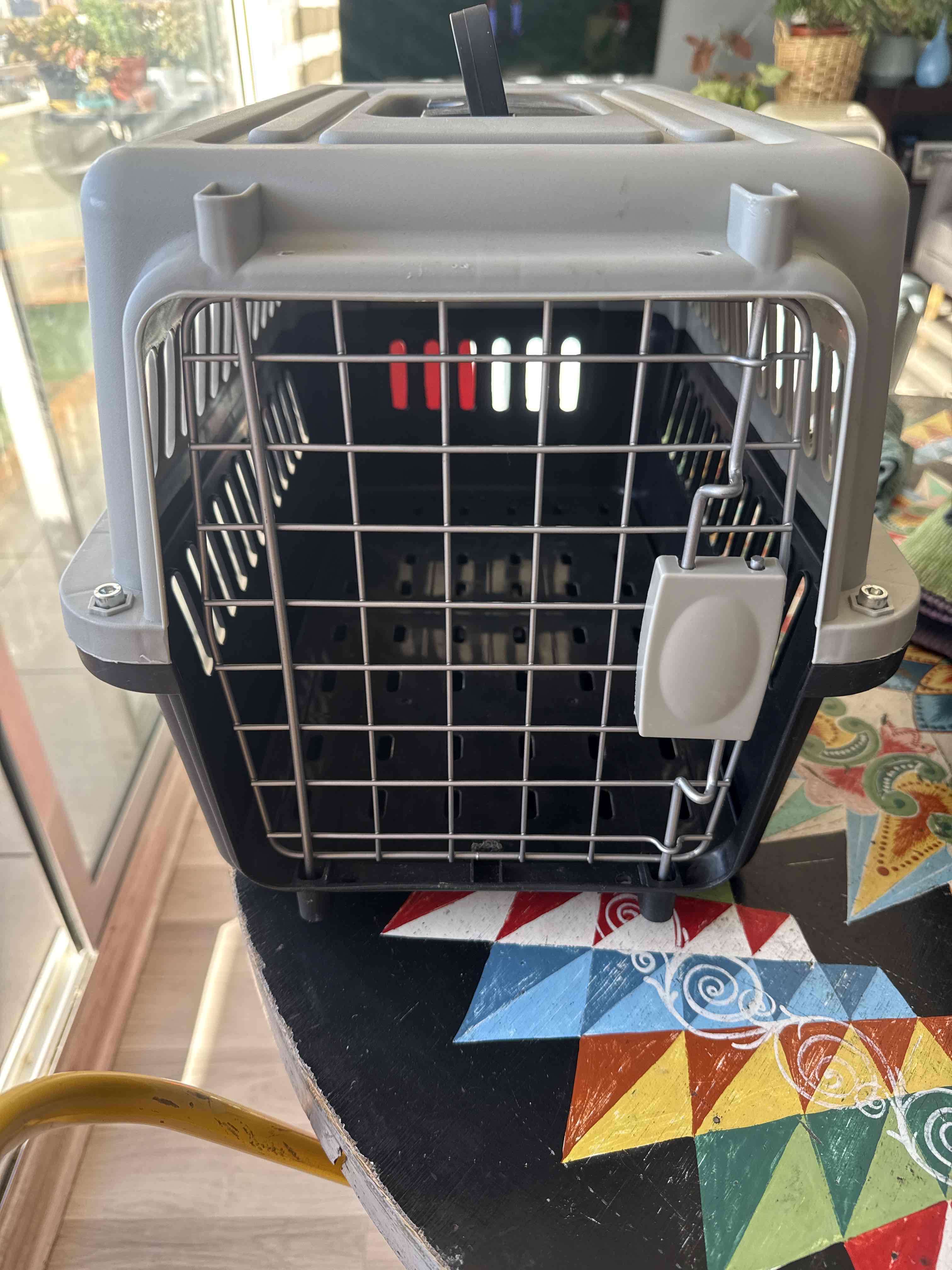 Jaula transportadora para mascotas de tamaño mediano, en buen estado, ideal para viajes seguros.