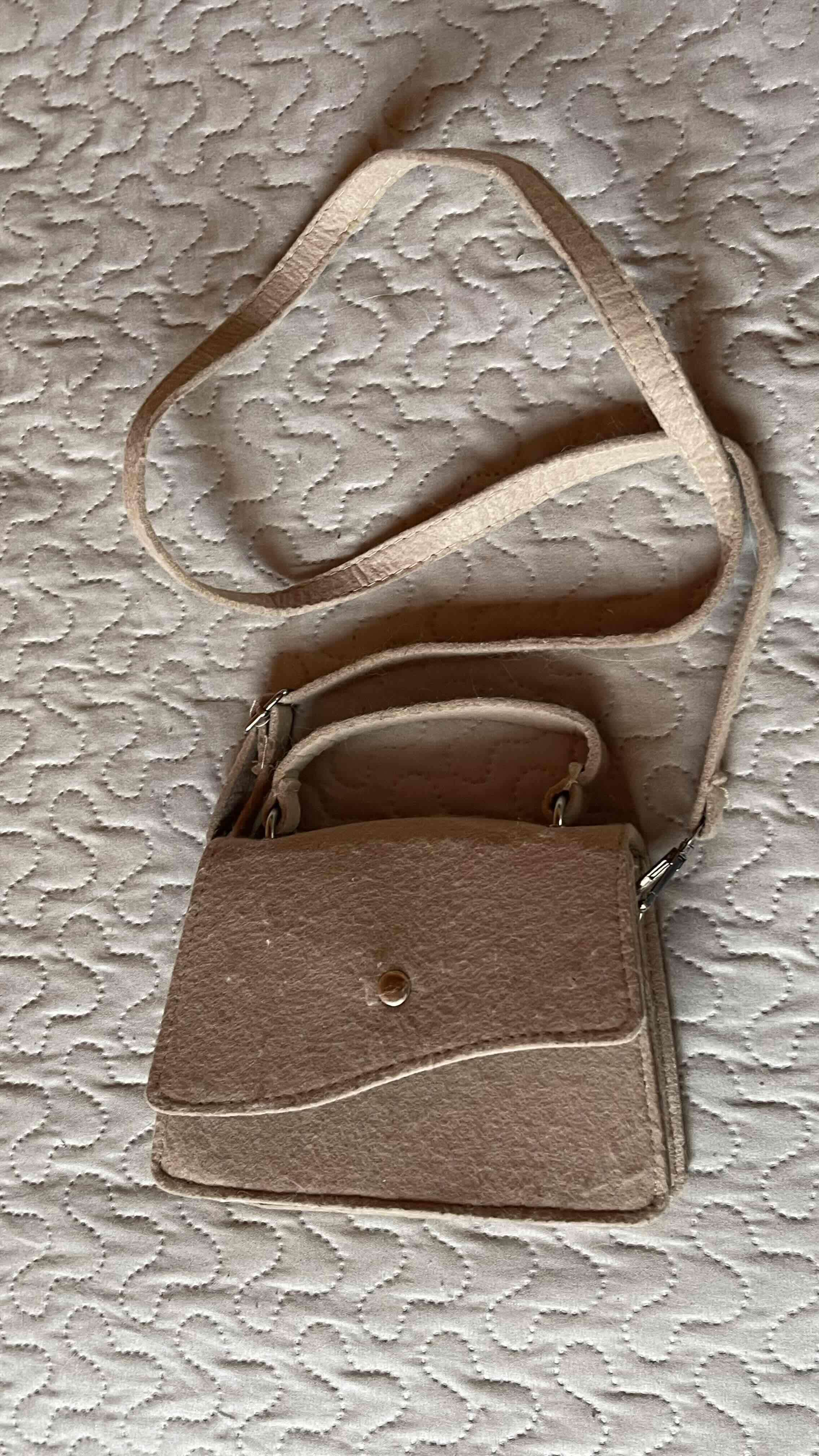 Cartera pequeña en tono beige con correa ajustable. Ideal para salidas casuales y en buen estado.