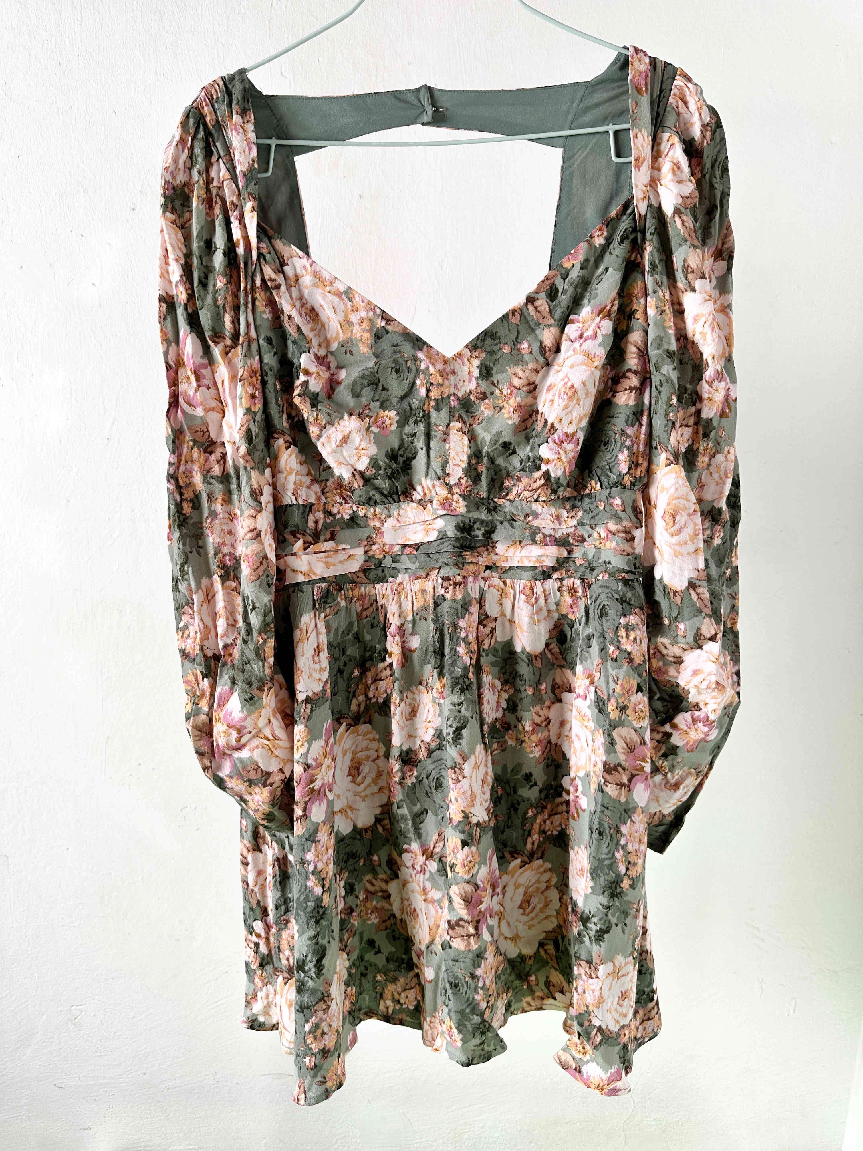Vestido corto con estampado floral y mangas abultadas. Ideal para eventos casuales. En buen estado.