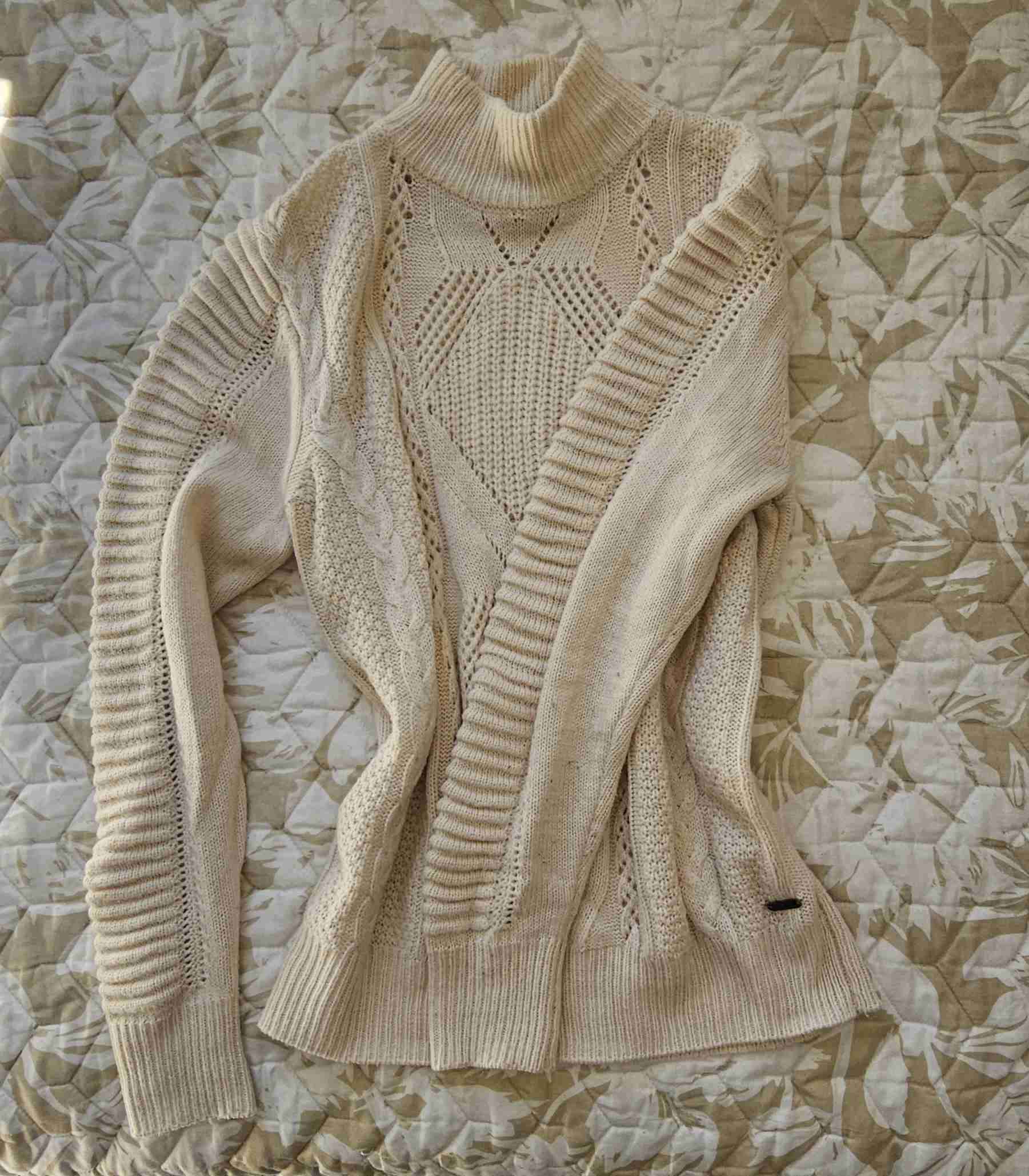 Suéter de punto beige con cuello alto. Ideal para el invierno, en buen estado general con detalles de punto únicos.