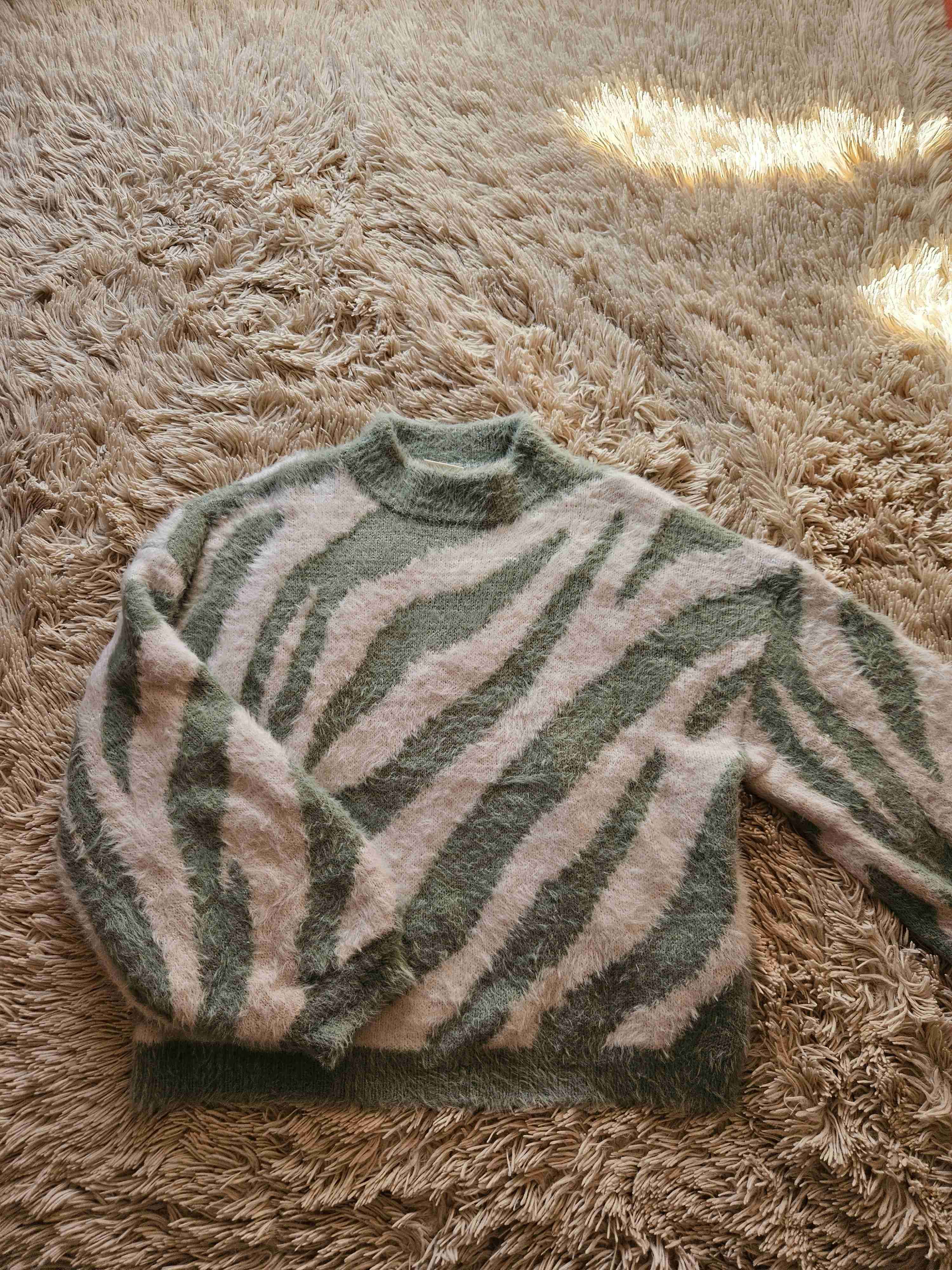 Suéter cálido con estampado de rayas verde y beige. Ideal para el invierno, sin detalles.