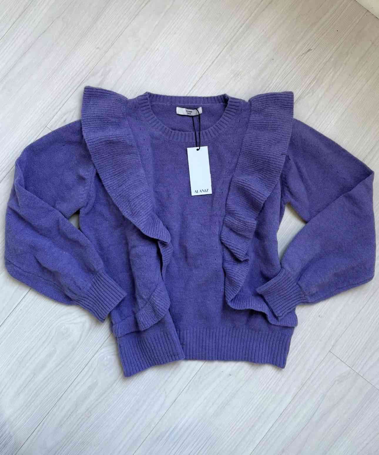Suéter morado con elegantes volantes, ideal para ocasiones casuales. Nuevo con etiqueta y en excelente estado.