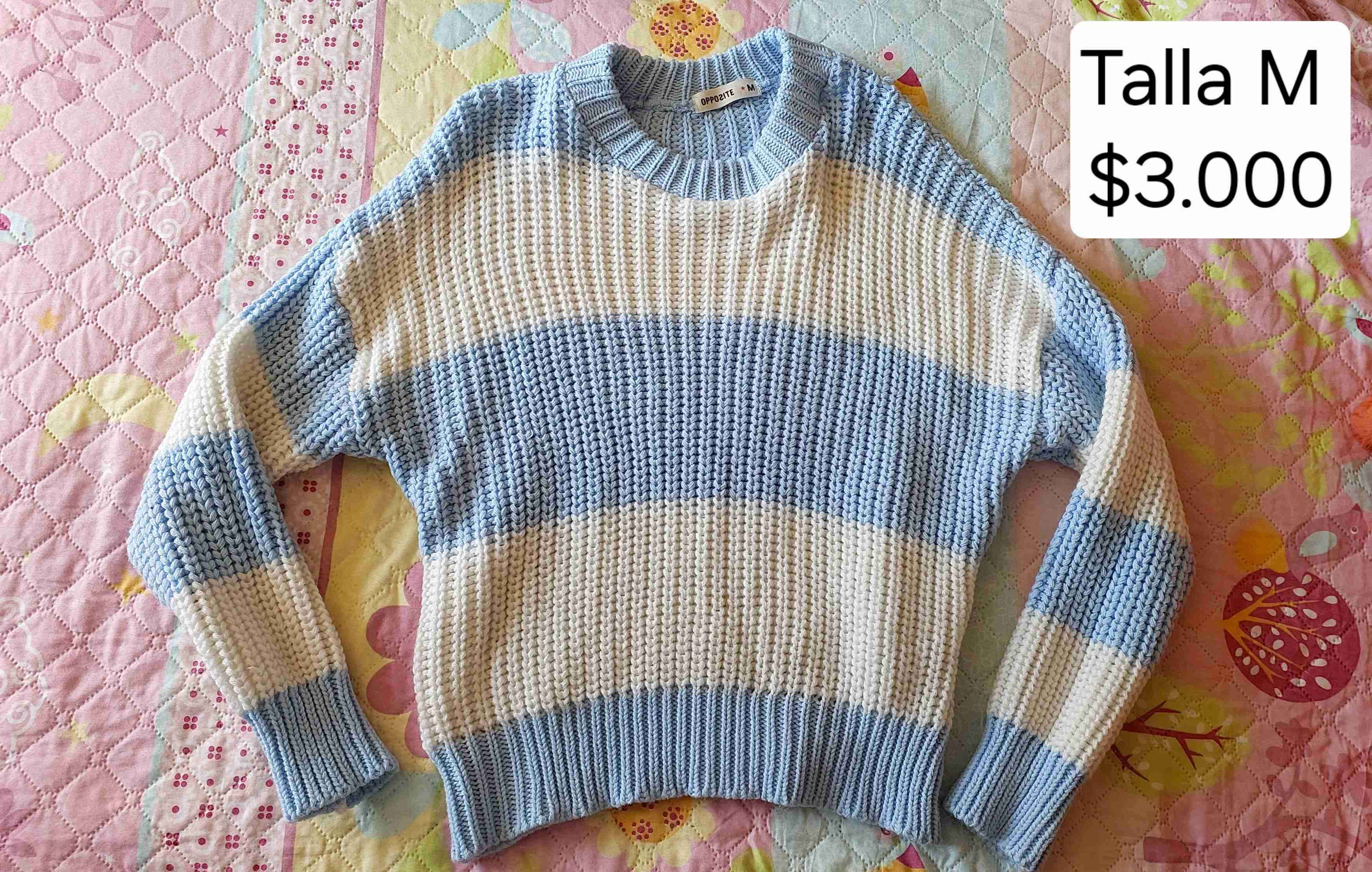 Suéter de punto en tonos celeste y blanco, talla M. Perfecto para días fríos, en buen estado.