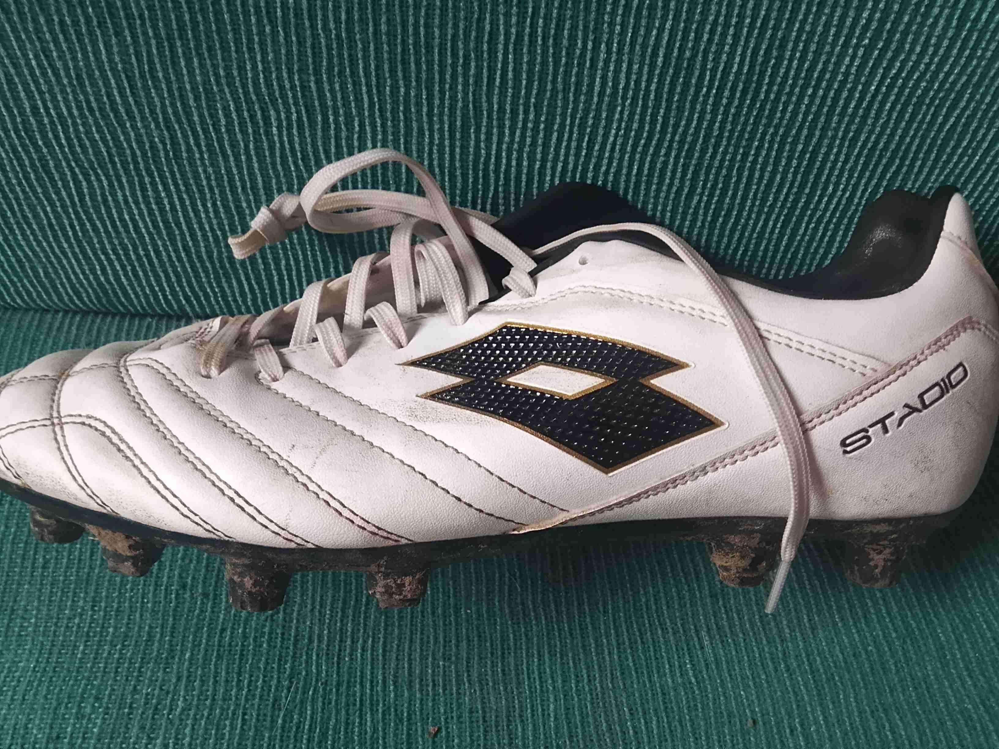 Botines de fútbol color blanco con detalles en negro. Usados con un poco de suciedad en los tacos. Ideal para jugar en pasto.