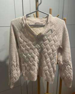 Sweater Umbrale mujer color crudo, corto, ajustado, tallaje pequeño con hilos con brillito entremedio del tejido , talla XS. CASI SIN USO, EXCELENTE ESTADO.