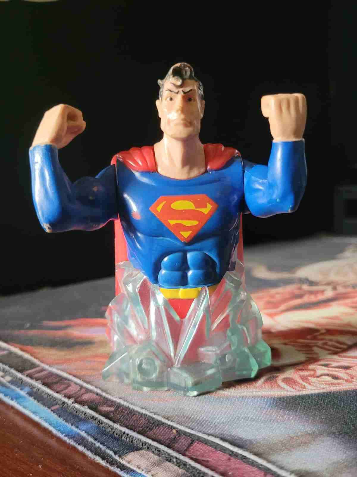 Figura de acción de Superman. En buen estado con algunos detalles menores visibles. Vintage 1980s Bakery Craft TM & DC Comics Superman Light-up Poseable Cake Topper