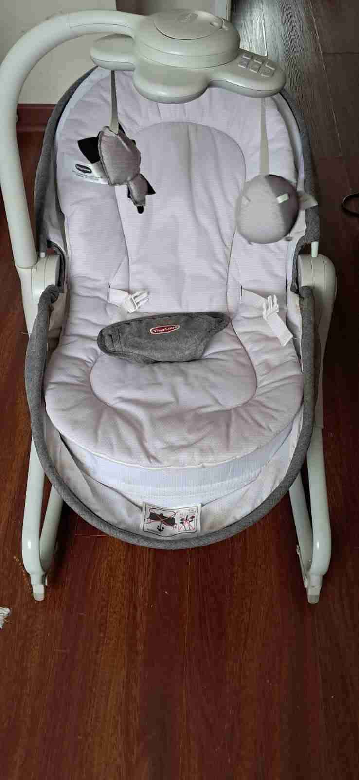 Silla mecedora compacta y cómoda para el bebé. Incluye juguetes colgantes y es ideal para el hogar. En buen estado general. Más ropa de bebe de regalo por la compra