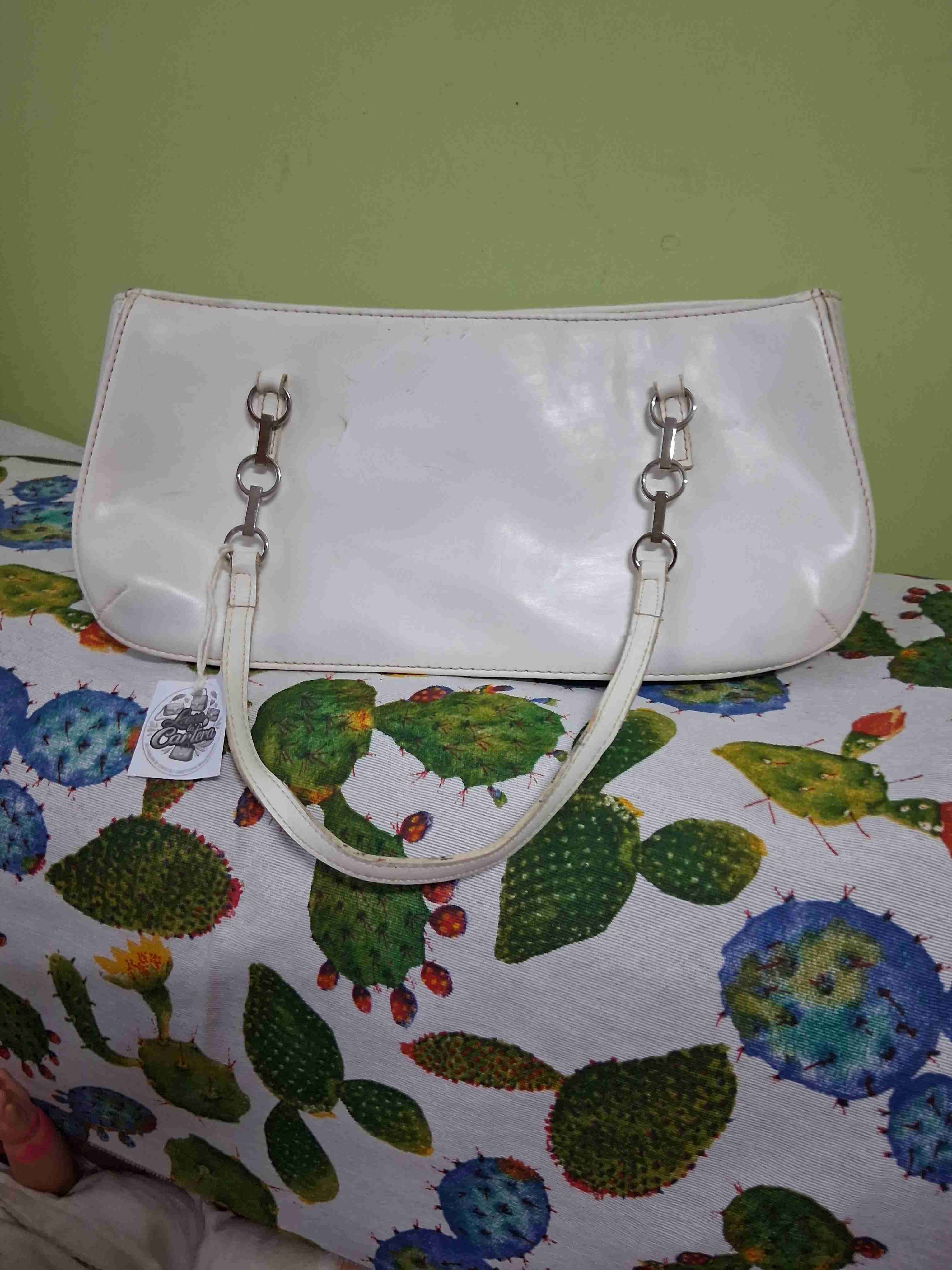 Bolso blanco con detalles metálicos y diseño elegante. Ideal para salir o eventos formales.