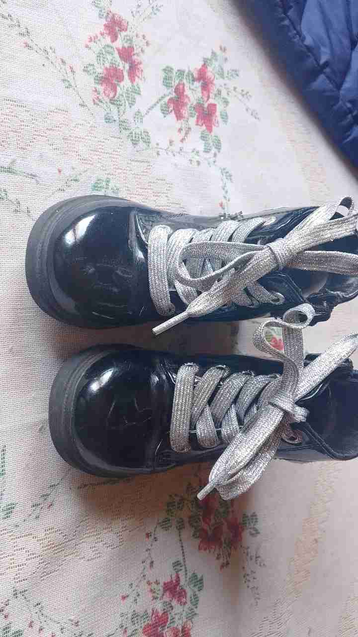 Botas de charol negras para niños, en buen estado con cordones brillantes. Perfectas para invierno o días de lluvia.