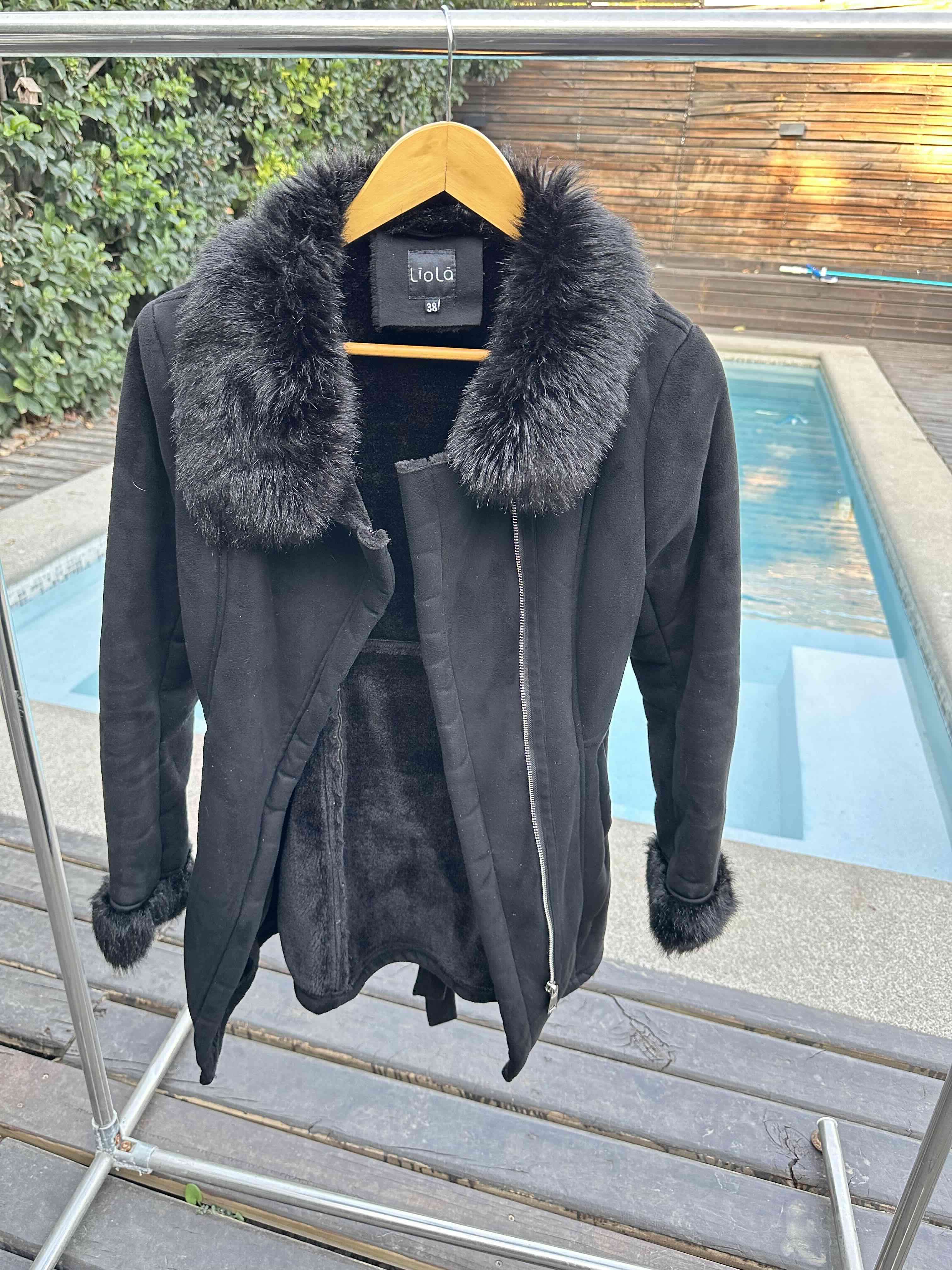 Abrigo elegante de color negro con cuello y puños de piel, ideal para el invierno. En buen estado.