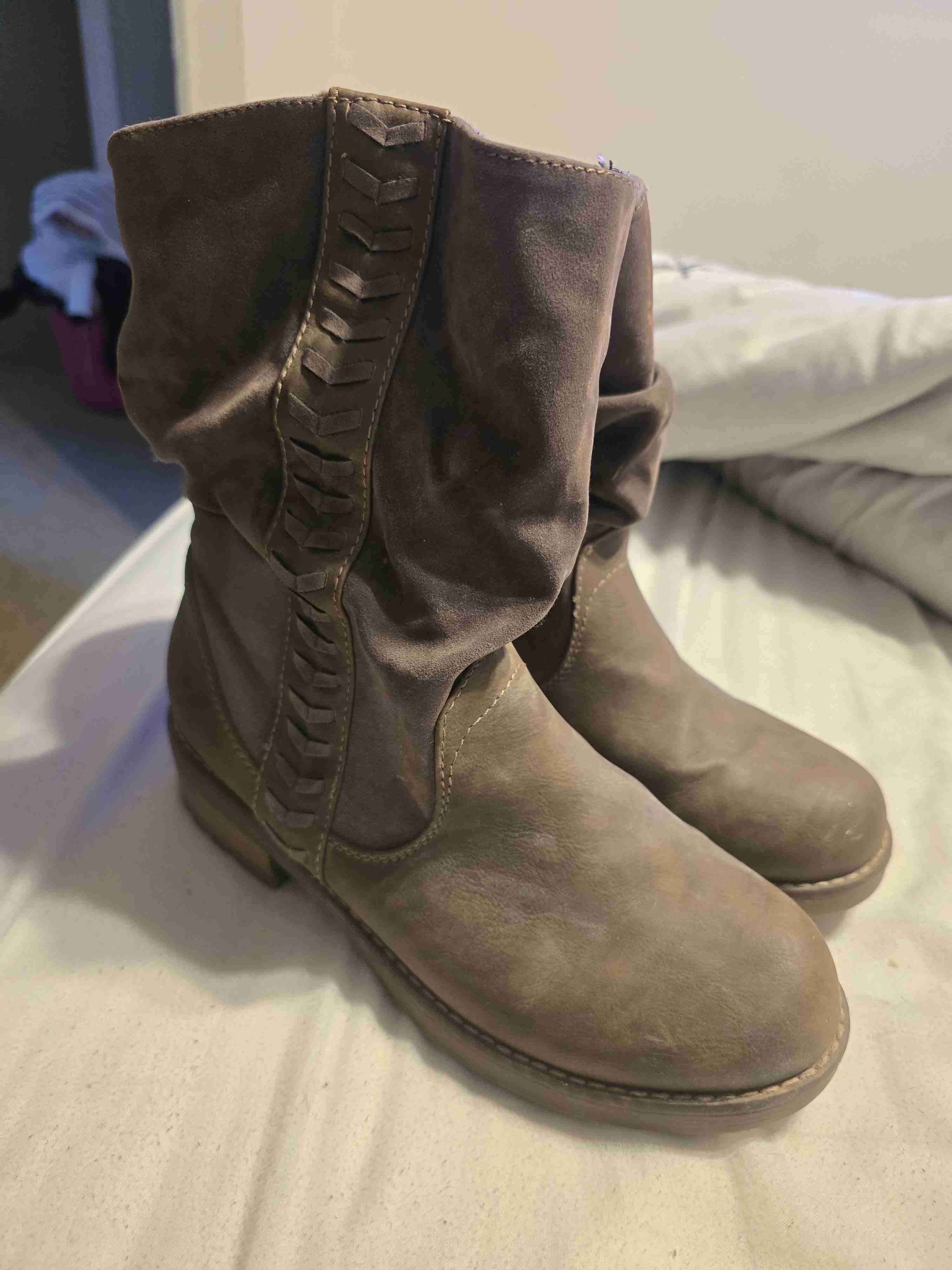 Elegantes botines de cuero sintético marrón, perfectos para el día a día. En buen estado general solo un detalle de color en uno de ellos ideales para el otoño.