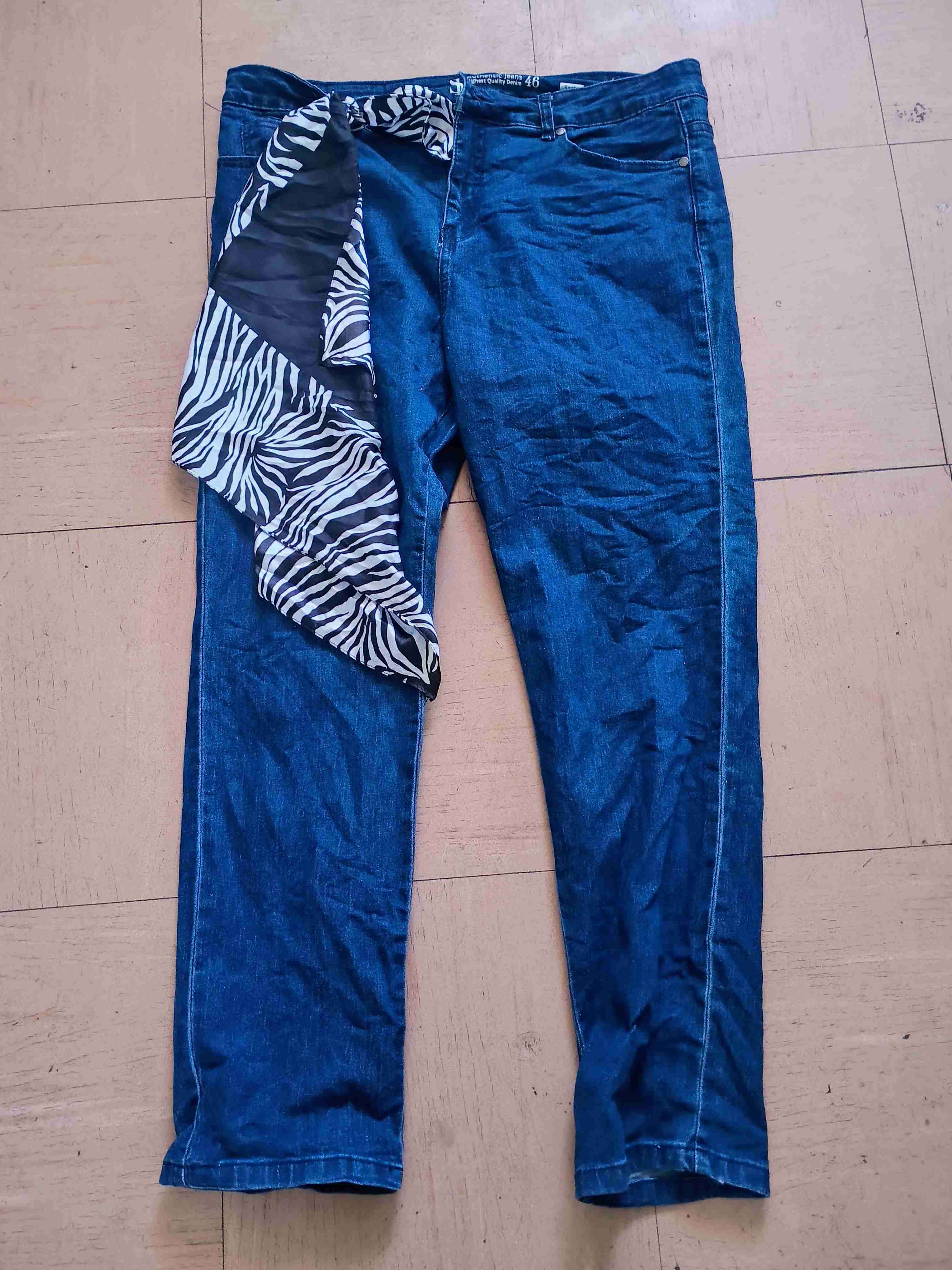 Jeans azul con detalle de pañuelo estampado cebra, ideal para un look casual. En buen estado general.