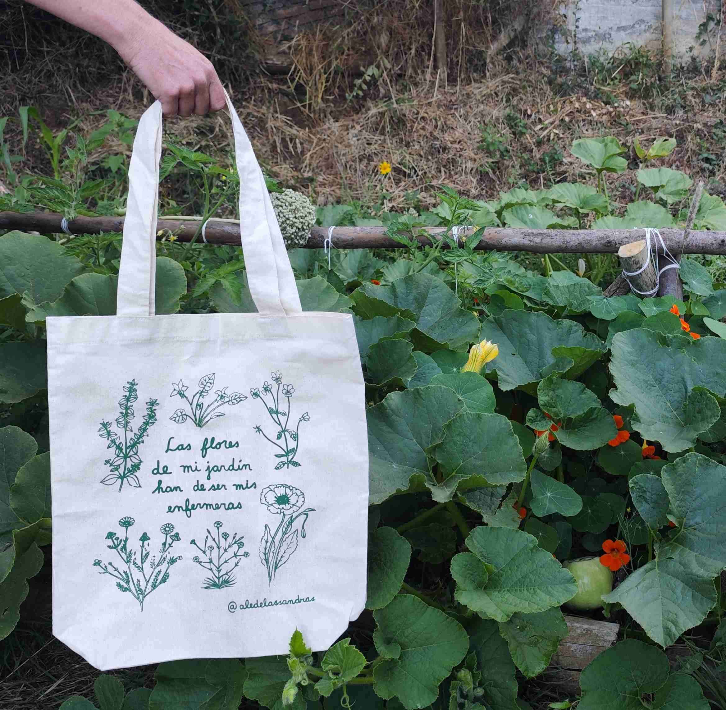 Bolsa de tela con diseño botánico. Ideal para compras o uso diario. Buen estado.