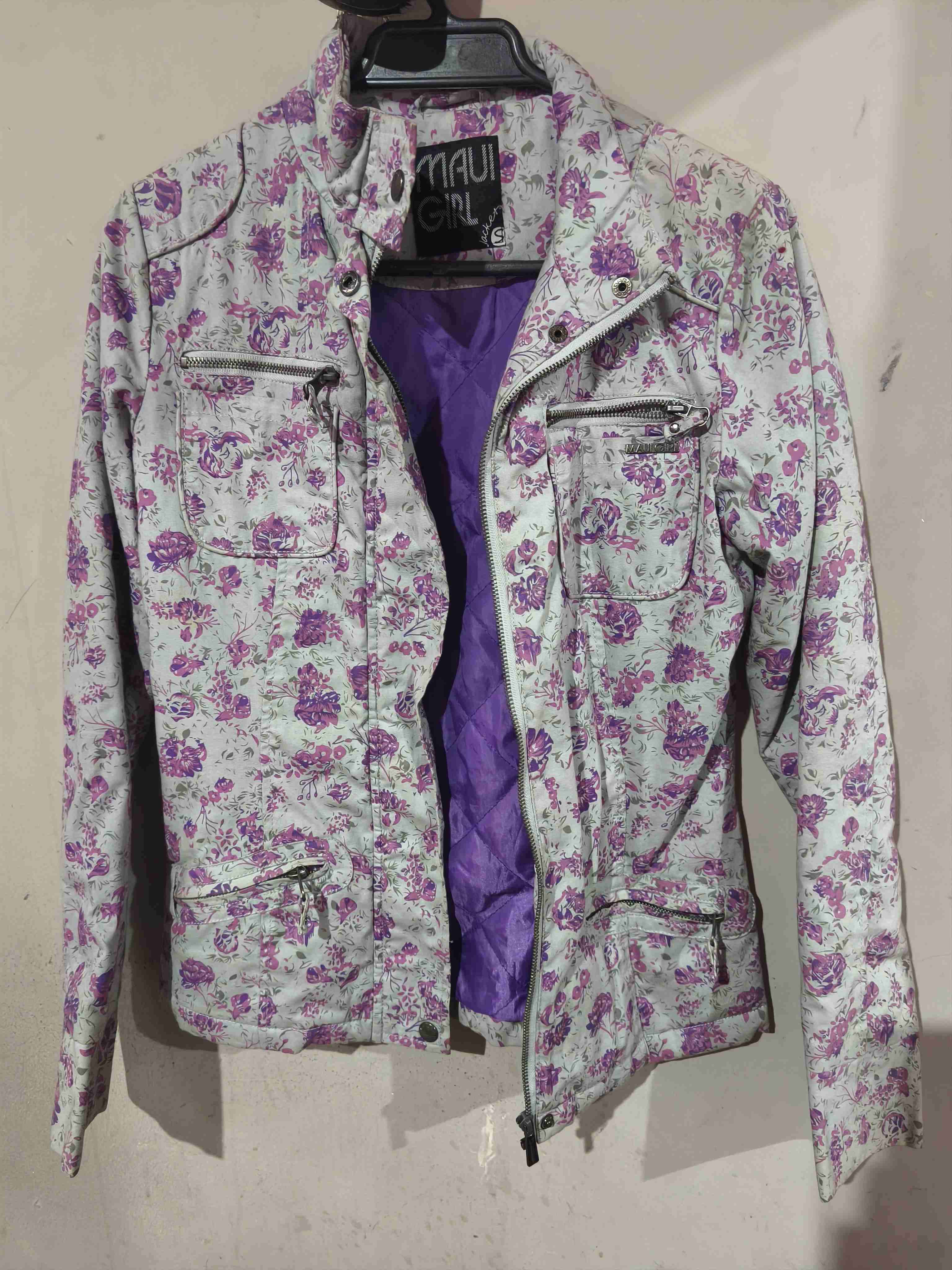 Chaqueta gris con diseño floral morado, en buen estado. Ideal para primavera y otoño.