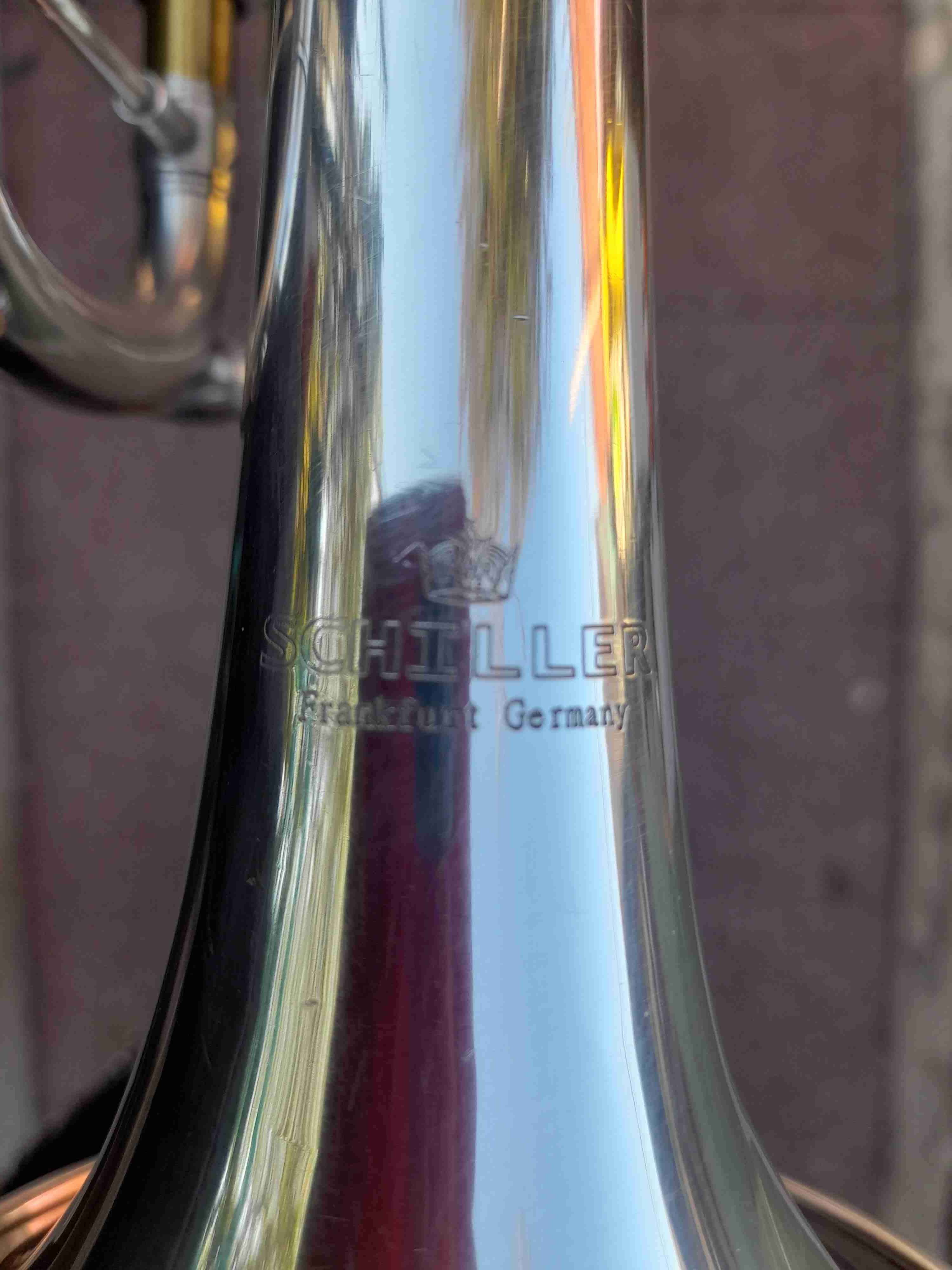 Trompeta en buen estado, ideal para músicos aficionados o profesionales. Marca Schiller, fabricada en Frankfurt. Sonido claro y potente.