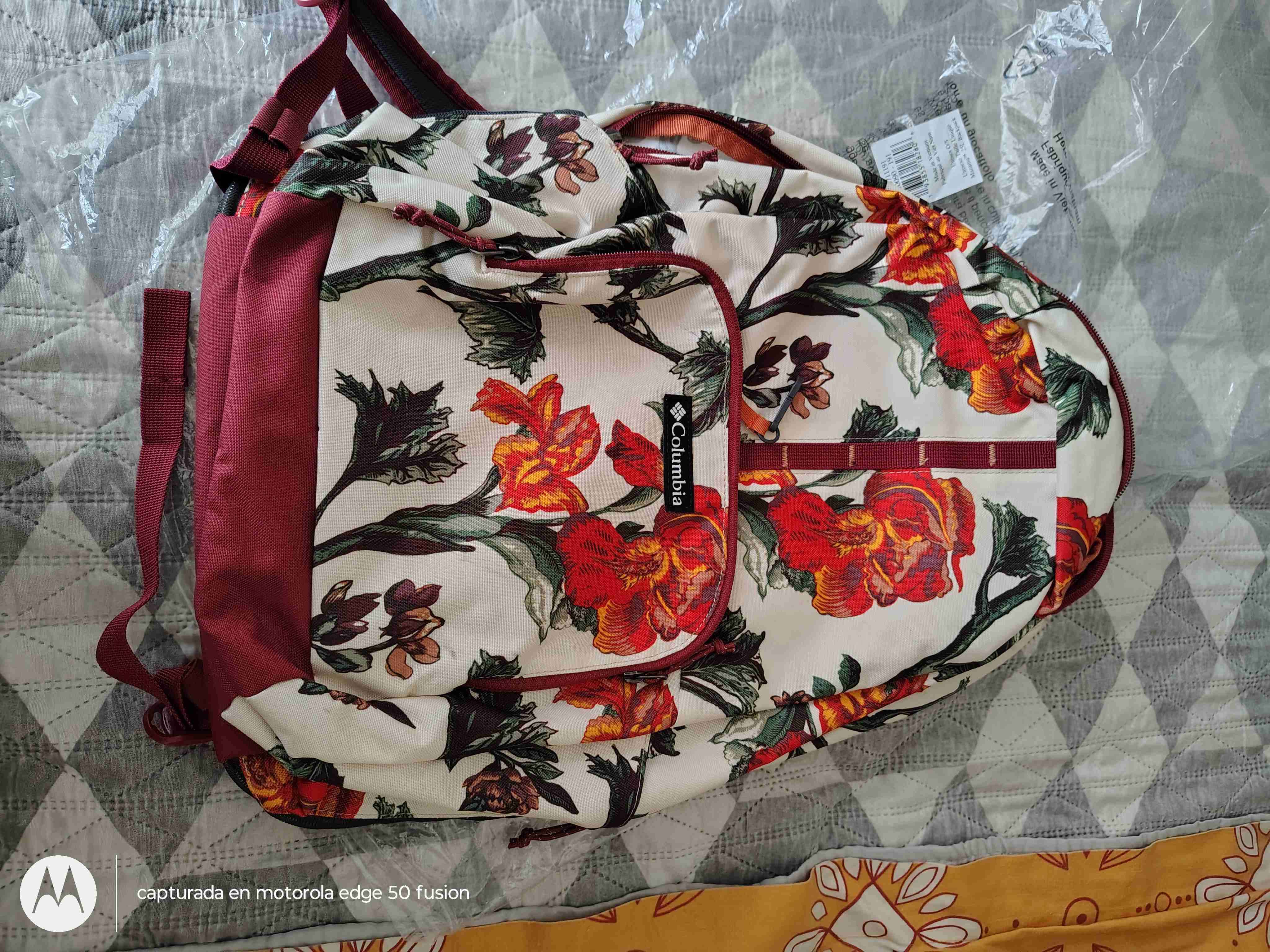 Mochila Columbia con diseño floral, ideal para el día a día o viajes. Original , solo un uso. 25 litros de capacidad