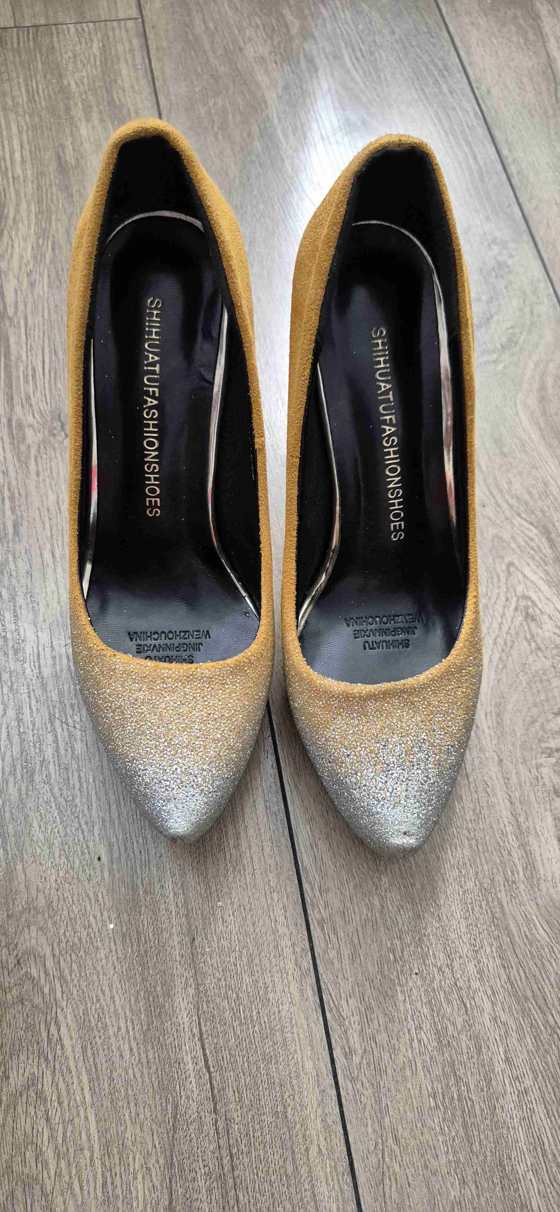 Tacones elegantes dorados con detalles de glitter, perfectos para ocasiones especiales. En buen estado, muestran leves signos de uso.