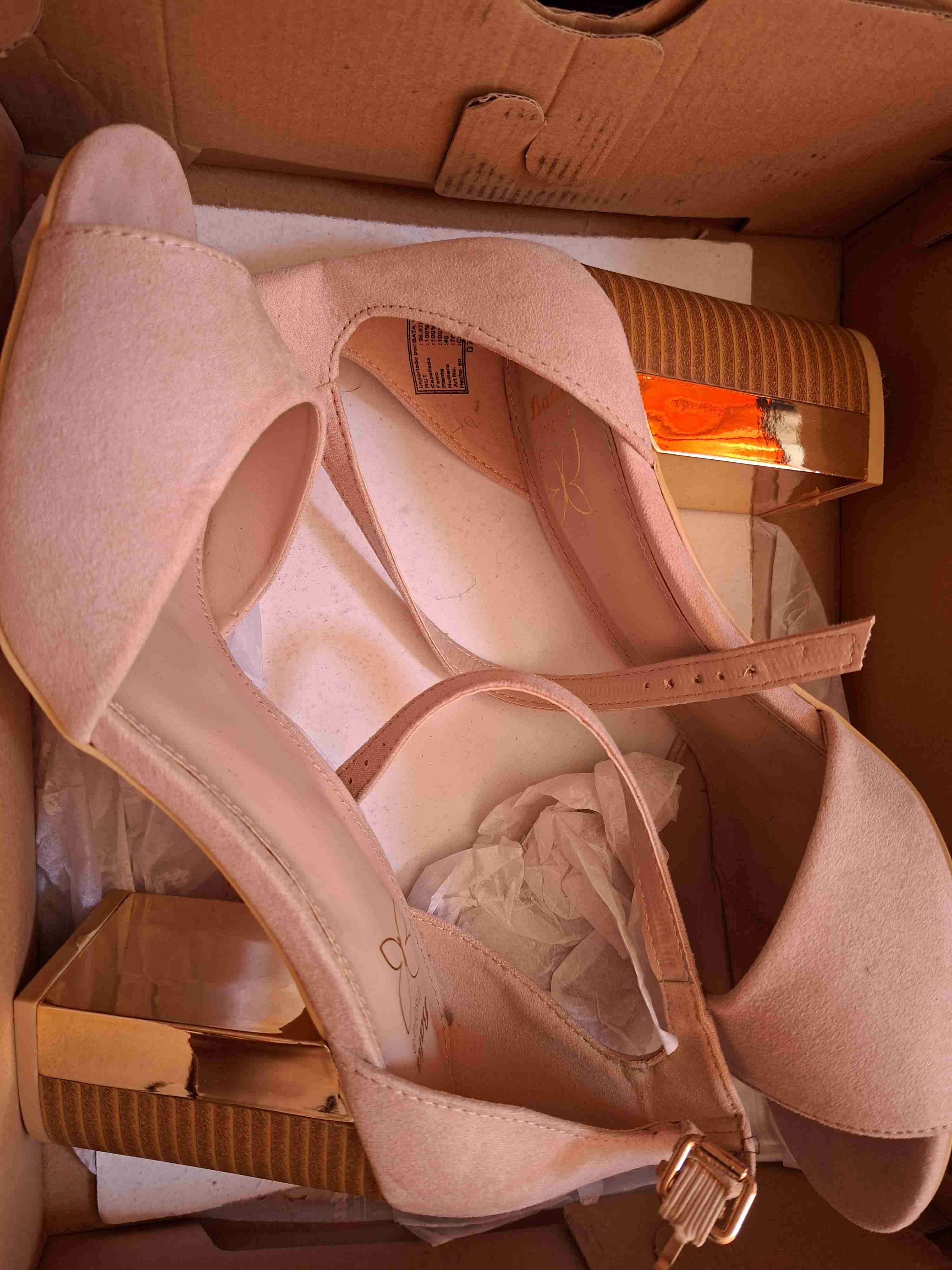 Elegantes tacones rosados con detalles dorados, perfectos para ocasiones especiales. Buen estado general, un solo uso