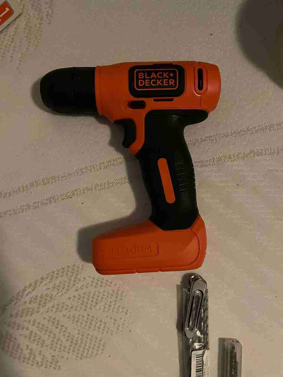 Taladro Black+Decker, batería, y brocas de diferentes milímetros a disposición, en su caja con manual y cargador.