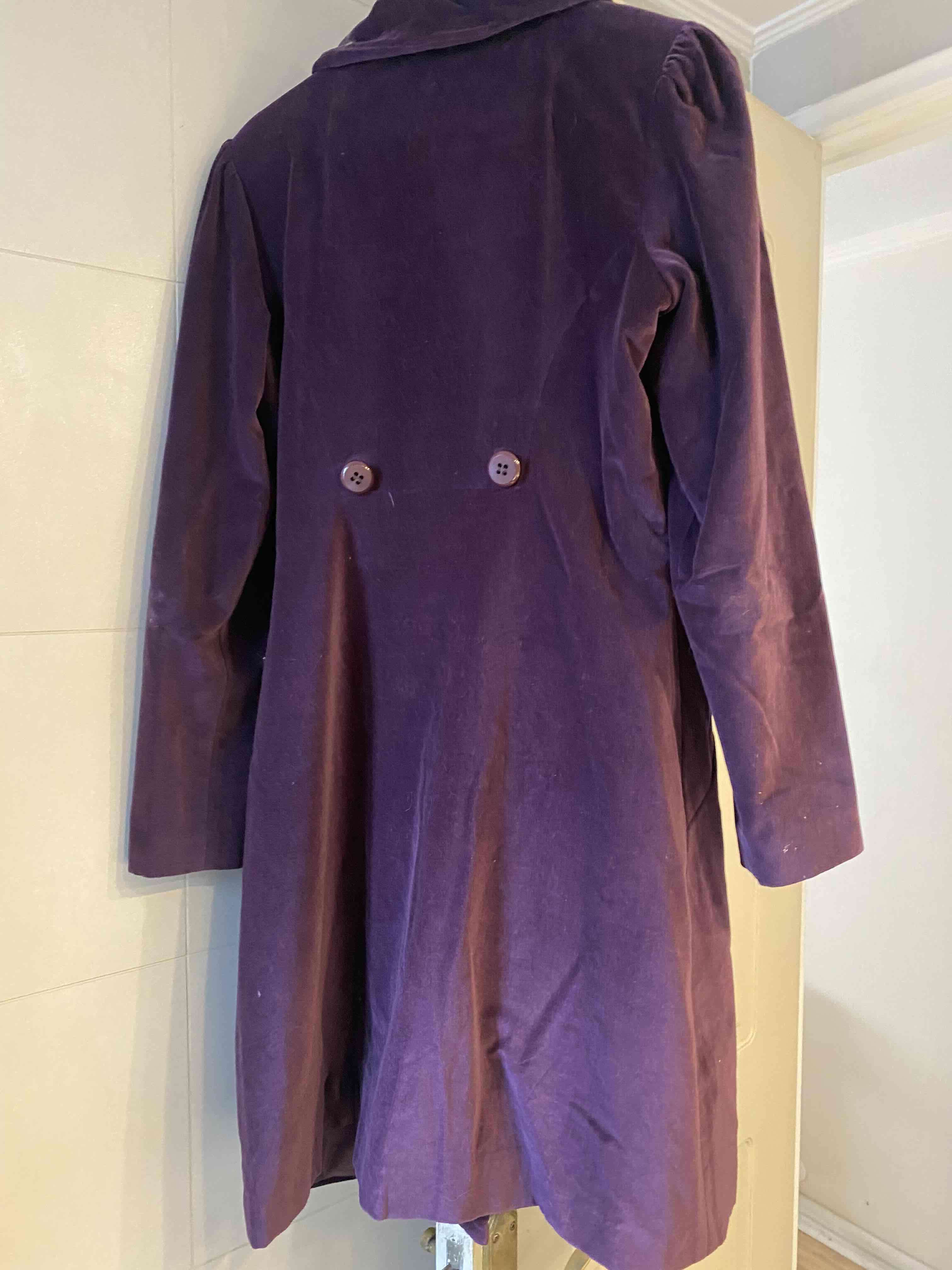 Abrigo largo de color morado, estilo vintage. En buen estado general, ideal para invierno.