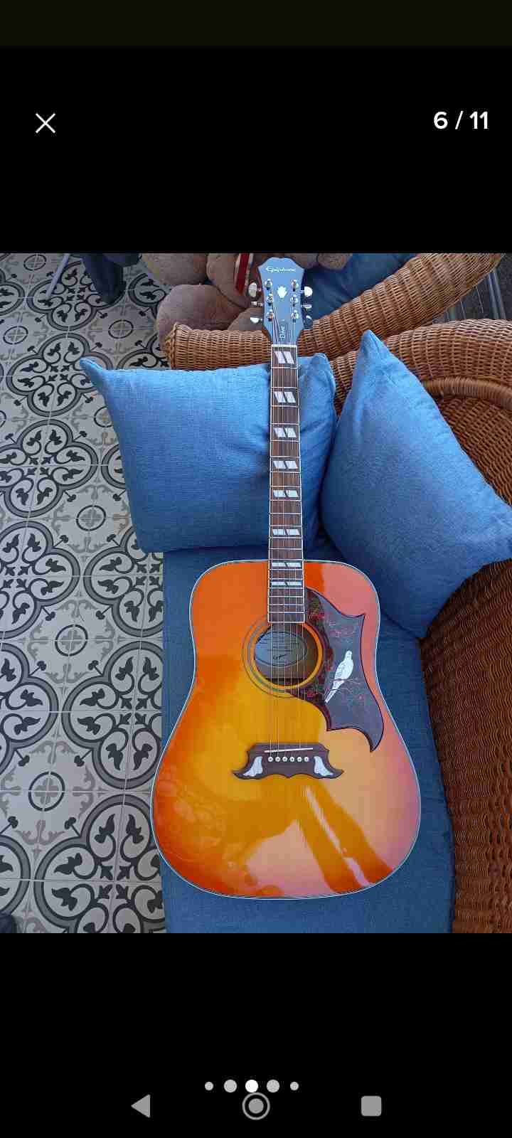 Hermosa guitarra acústica Epiphone Dove estudio con diseño vintage y tono cálido. En buen estado, ideal para músicos o coleccionistas. Viene en su caja original con documento original.