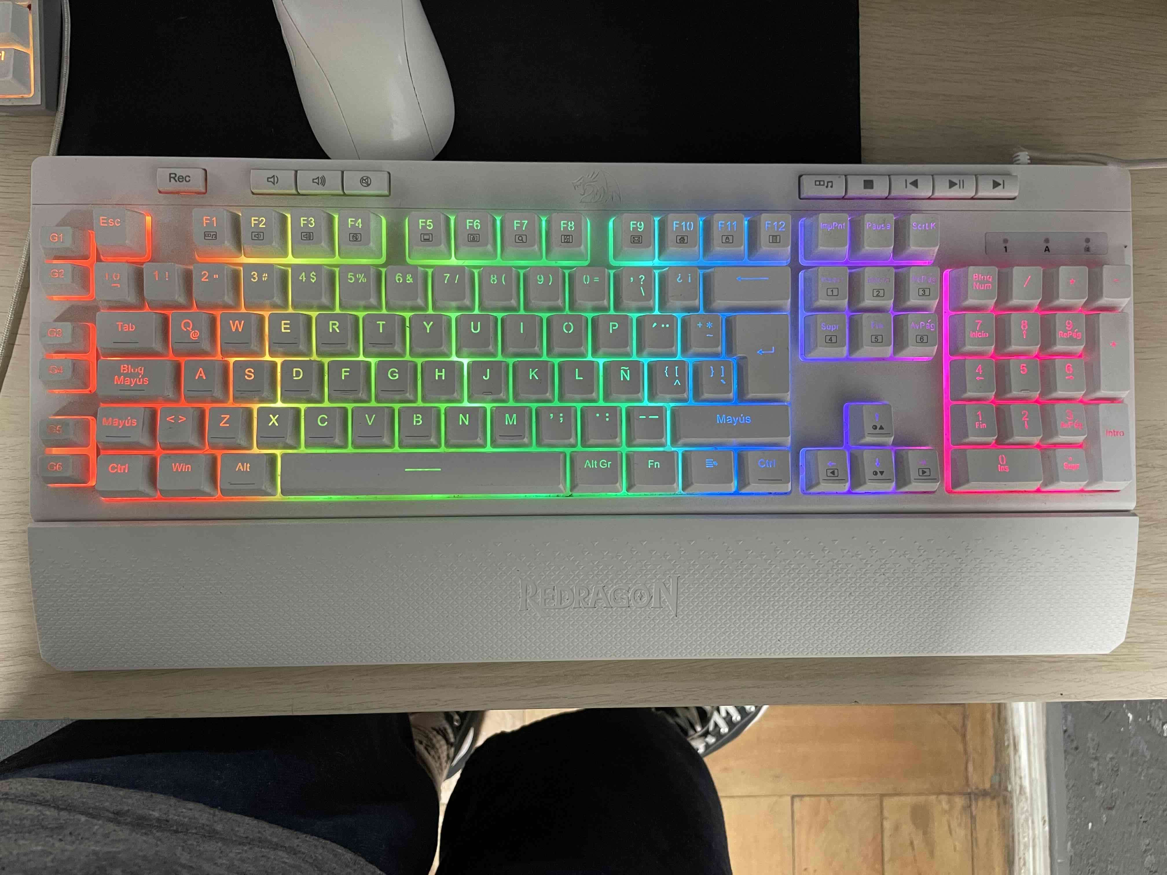 Teclado mecánico retroiluminado en buen estado. Ideal para gaming o trabajo, con luces RGB y acabado blanco elegante.