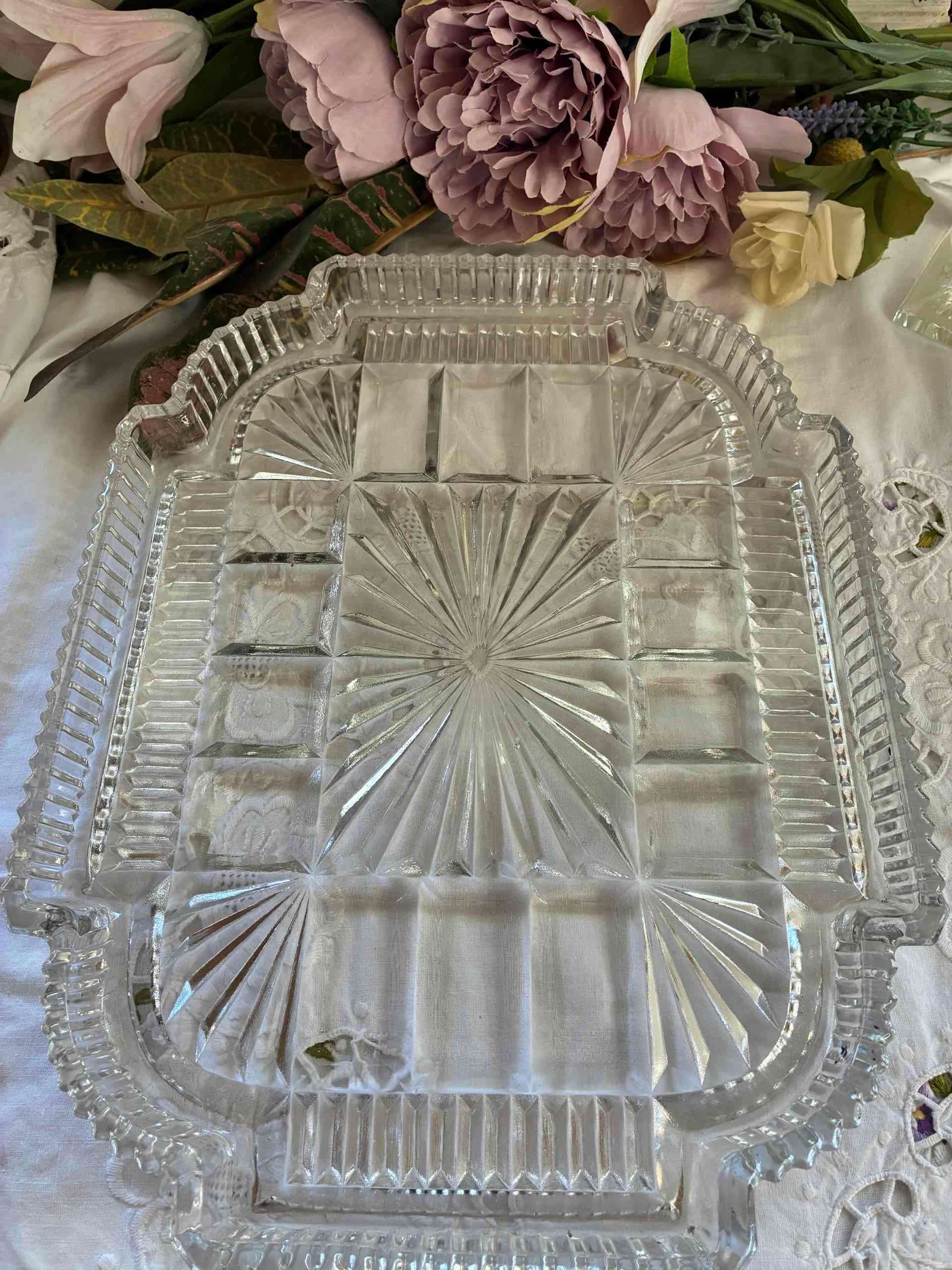 Elegante bandeja depression glass con diseño tallado, perfecta para decorar o servir. En buen estado, ideal para ocasiones especiales o para tocador.