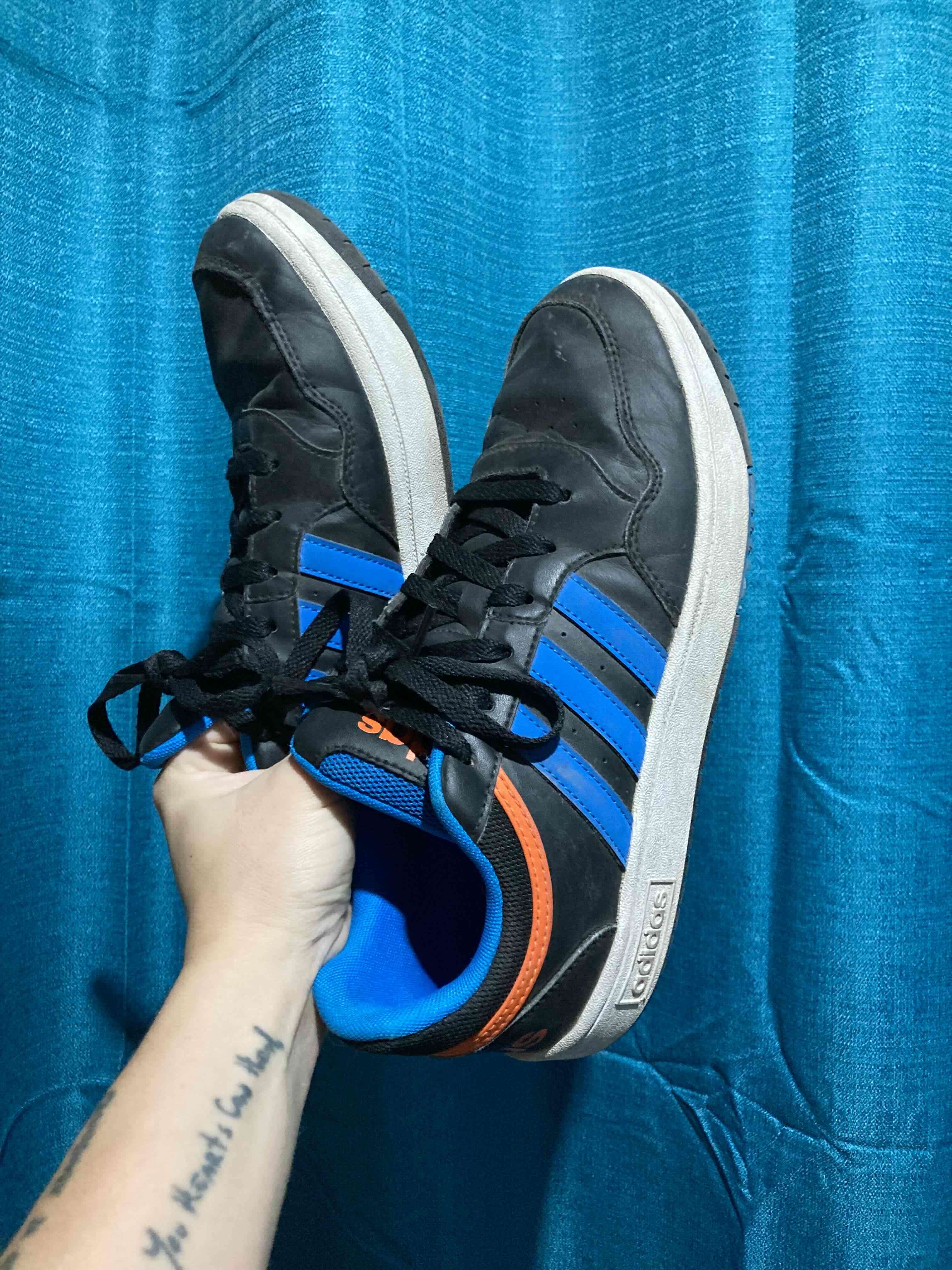 Zapatillas deportivas negras con detalles en azul y naranja. En buen estado, ideales para uso diario o actividades deportivas.