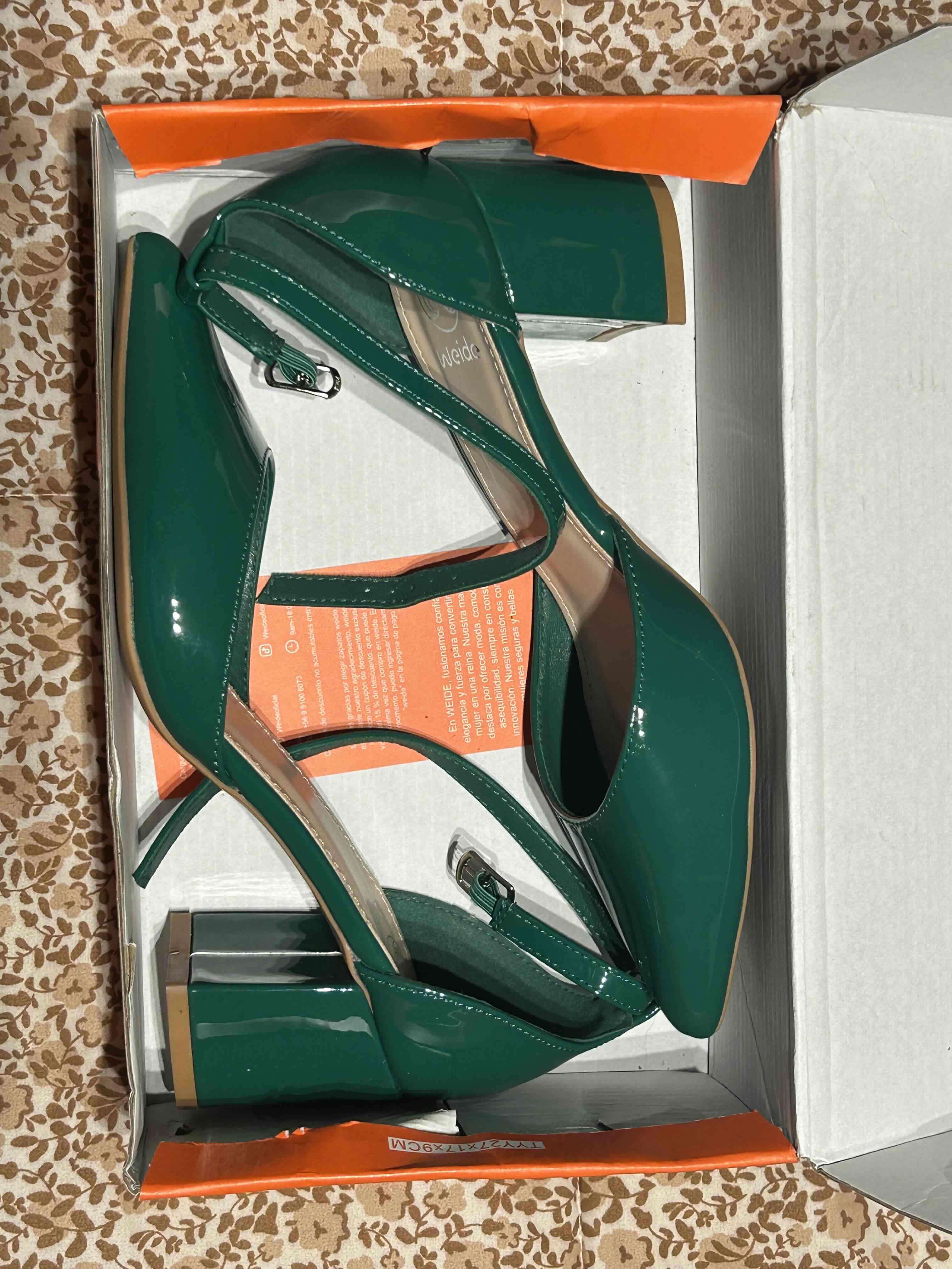 Zapatos verdes brillantes con tacón medio y cierre ajustable. Ideales para ocasiones formales.