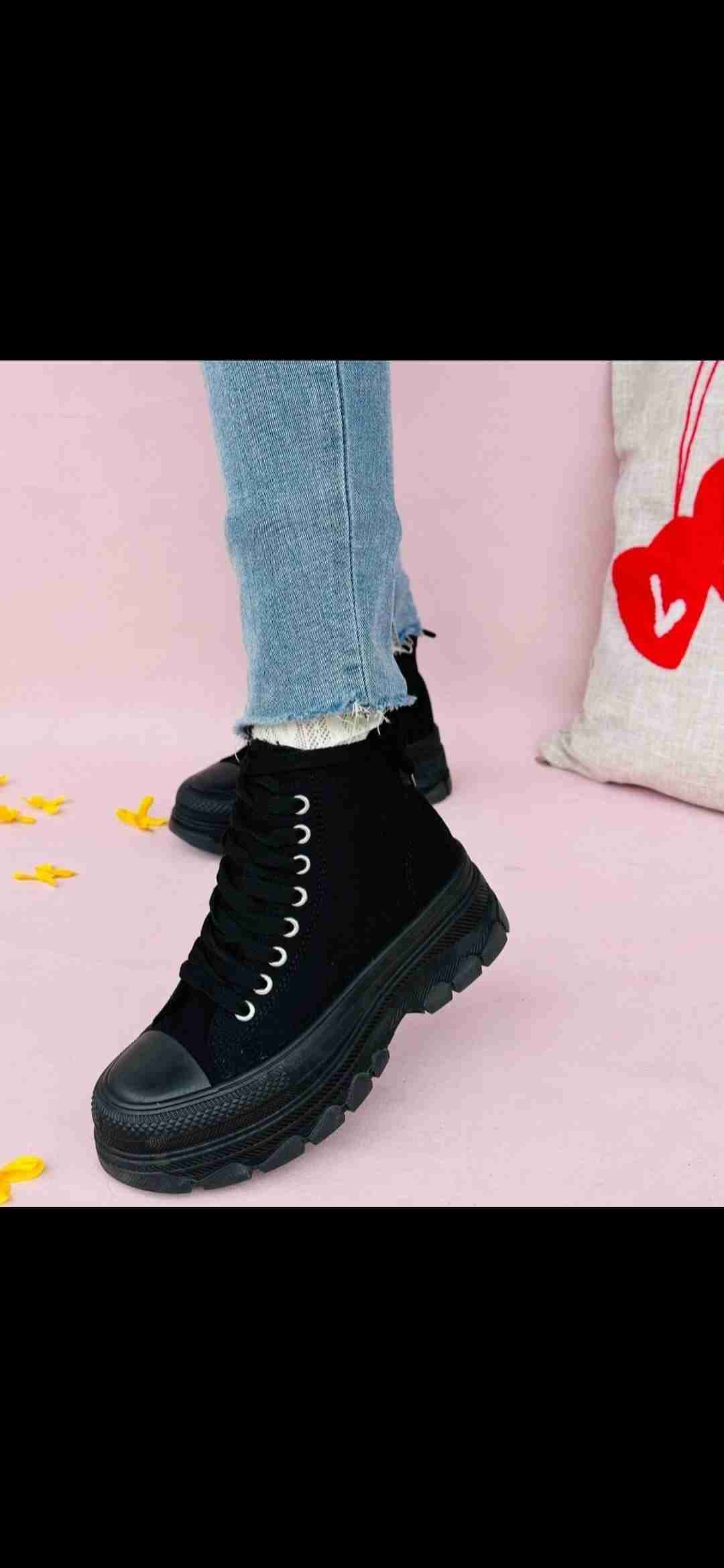Zapatillas de caña alta en color negro con plataforma robusta. Perfectas para un estilo urbano y cómodo. En buen estado general.